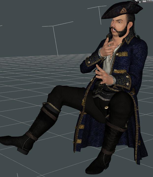 Challenge: Captain's Coat colliding with his legs. When I sat the Captain down, the coat went through his legs. No amount of dial spinning could fix it. I tried D-Formers, but they pulled on both sides of the coat at once (or maybe I don't know how to use them). Even so, the best that D-Formers could give me was a bulge in the side of the coat, and not the opened up look I wanted.