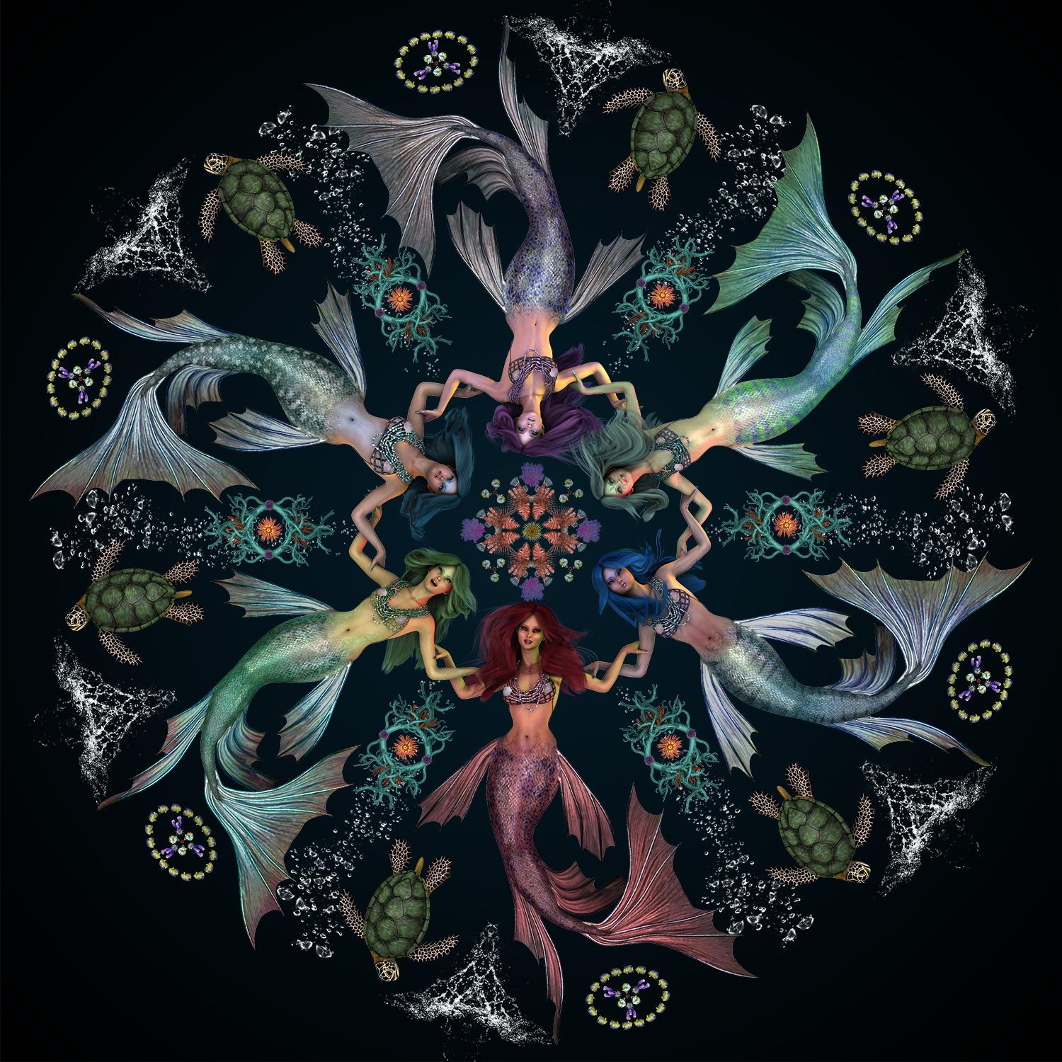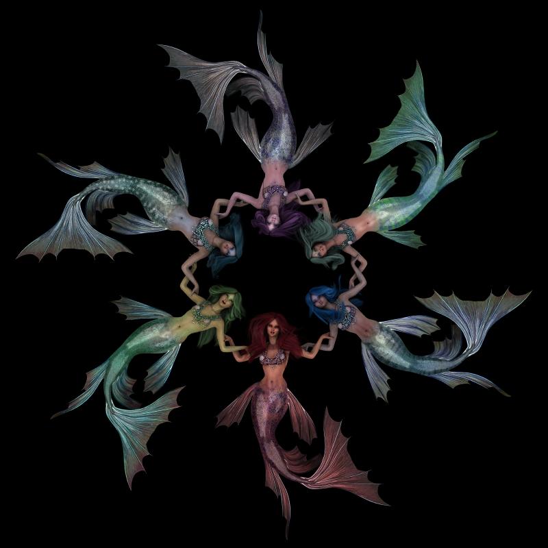 I created the bubble column and splash motifs in separate files using Ron's Water Brushes, then dropped them into a new layer and positioned them. The mermaids are actually the top layer and all my work was in layers below them. Don’t you just love the splashes looking like a manta ray? I thought it was particularly kewel.