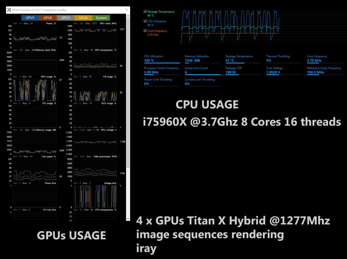 Here are GPUs and CPU usage while rendering image sequences using just 4 GPUs, as you see CPU 8 cores are used as well even if not selected under rendering setting , only when using 4 GPUs