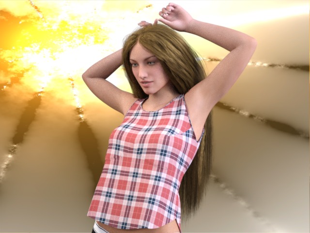 Anyway, here's tonight's effort. I started off with something simple so that I wouldn't encounter every difficulty at once. This one leaves me with two questions which I'm hoping the more experienced users on the forum might be able to answer. Firstly, nowhere does the garment actually touch the figure. It's not noticeable from a distance, but close up you can really see where the straps of the vest stand proud of the shoulders a bit. I was wondering if anyone knows how to fix this. The second thing is maybe more of a Daz issue than an MD one and something that I probably ought to know how to fix by now :) I'm talking shrink-wrapped boobage - you can see the fabric trying to disappear under Gen3's bust-line and the problem is even more pronounced with other poses.