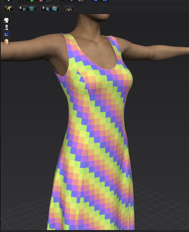 Still learning loads here (mostly why so many PAs are fond of 'short and clingy' variants :) ). Anyway, this morning I made myself a checkered fabric texture in Photoshop and life with Marvelous Designer has been a lot easier since. It's not pretty, but it's not meant to be. The squares are 1 inch by 1 inch, which makes it easy to eyeball measurements in the 2D window and just as simple to see in the 3D window where things are straining or sagging. The rows of different colours are helpful in determining where what's going on in one window relates to what's going on in the other. I generally use the texture just as it is, but for more complicated stuff I make more than one material, using the same texture but giving each a different diffuse colour so that things look less chaotic and it's easier to see what I'm doing. The final materials go on when I'm done. I expect the old hands have figured this out already and are using something similar, but the texture is below if anyone else wants it.