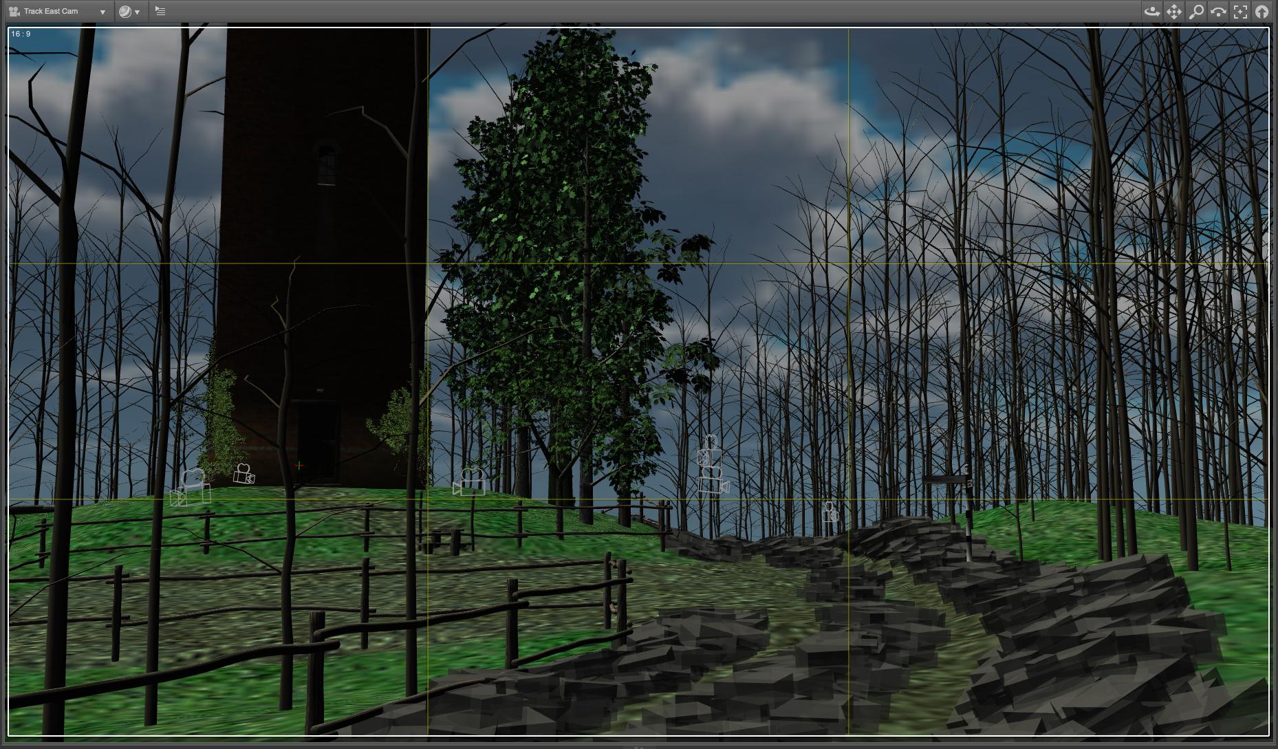 I've included a viewport shot that approximates to one of the track renders a few posts up. You can see the tree proxies and the bounding boxes for the grass track edges. The real tree models in the background are the masters for the instances.