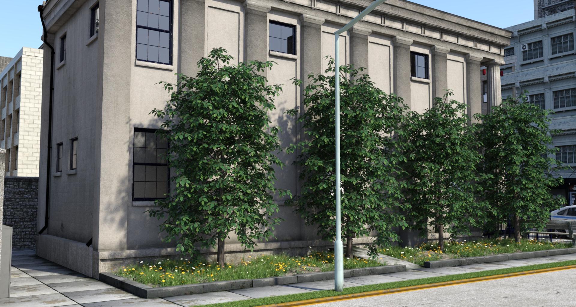 Trees: 7 individual models, grouped and used in 8 scatters (4 main scene scatters, 202 instances, 5 extension scatters, 740 instances, total 942 instances)