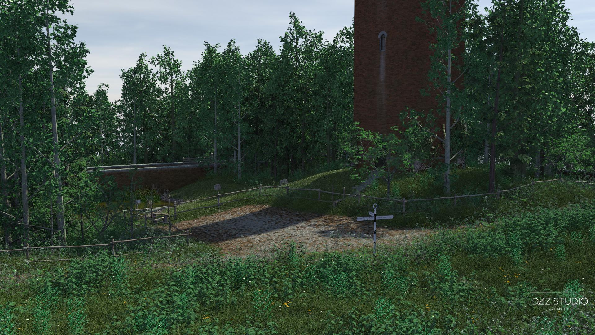 I have Hemlock Folly and Jackson's Field. With Hemlock Folly, you can remove the tower and it leaves a little grassy square, makes a nice secluded park. Just add a picnic table! And they both come in iray and 3dl versions.