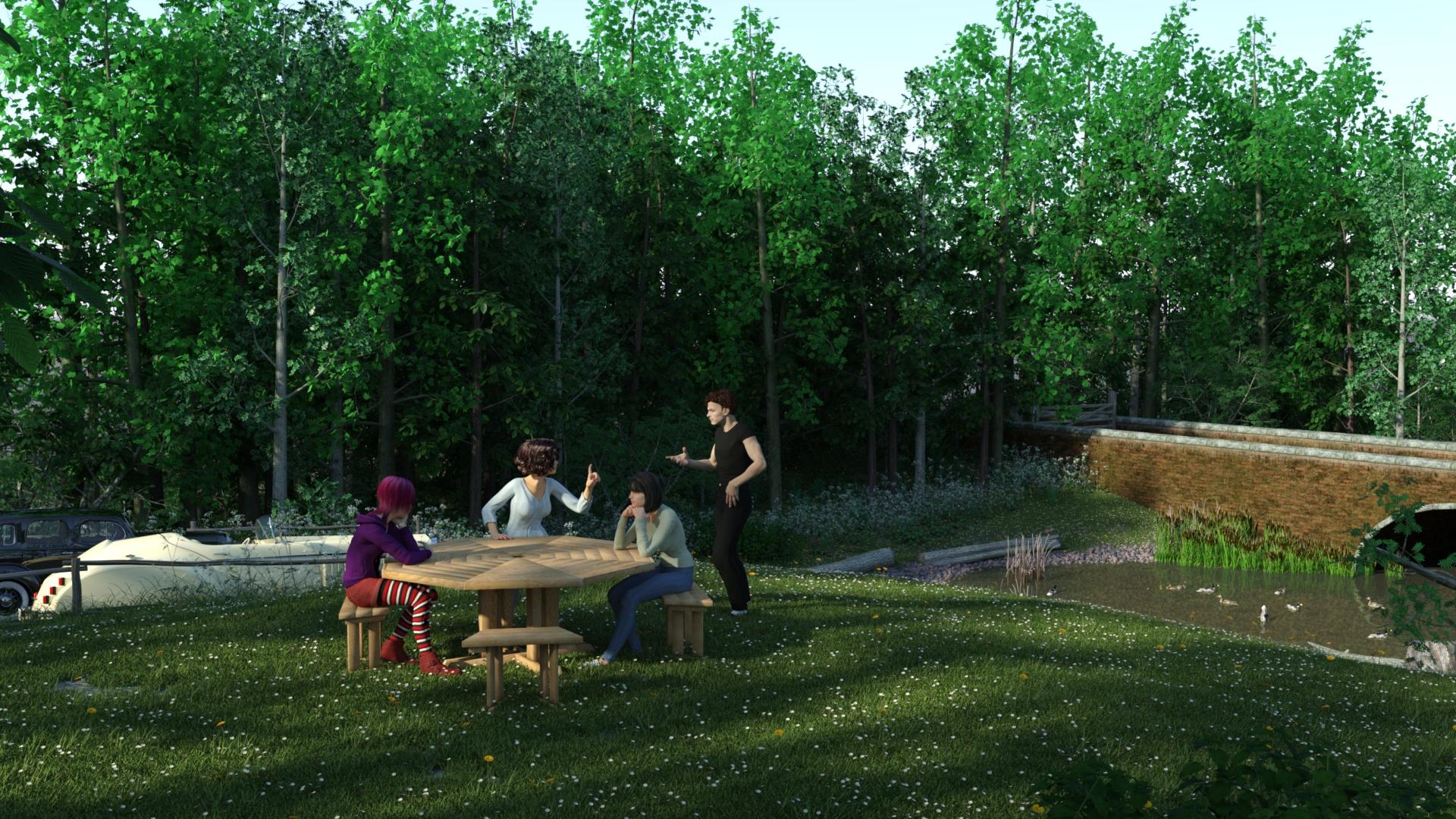 I added an extra grass patch that you can enable if you remove the tower, so it makes for a nice little picnic spot. (Iray render, 1 hour to 90% Picnic table from PC Carnival set, figures are Genesis)