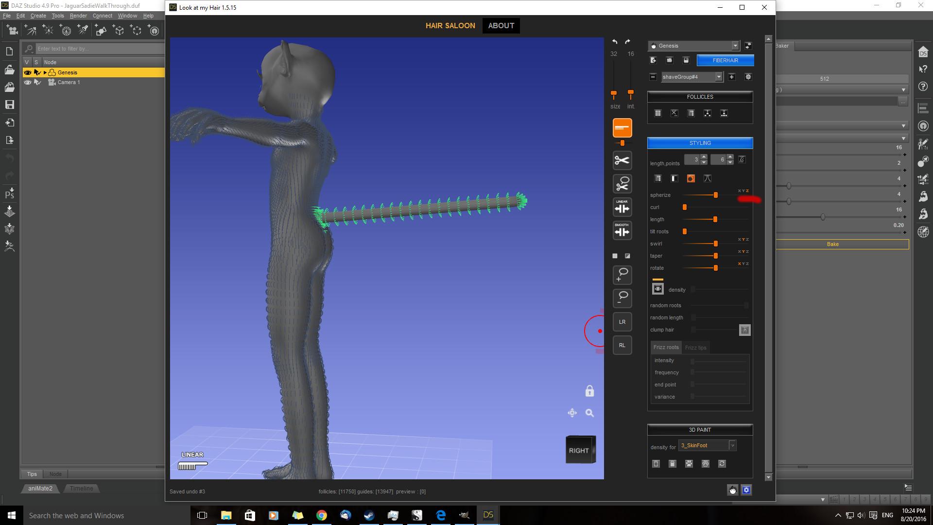 Shavegroup #4 is JS’s tail.  Using the spherize tool, this time change the x y z to the z.  This will move the guide hairs on the z axis and we want to move the slider to the right.