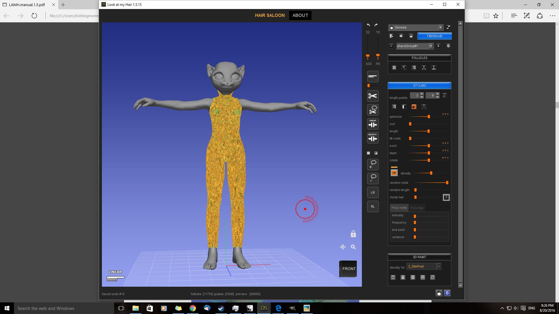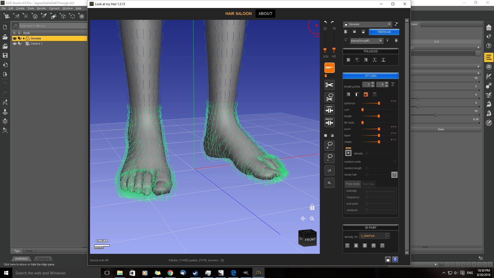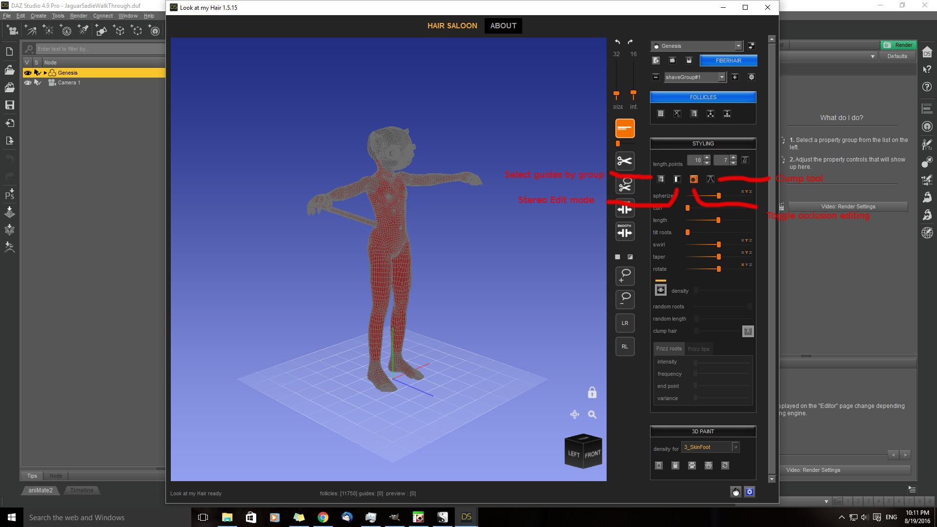 You will make mistakes!  I sure did!  If you do, just regenerate the hair for the group you are working with and groom it again.  I regrew the guide hairs for the feet about 5 times before I got it right.  Remember to save and save often.