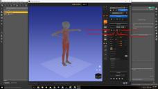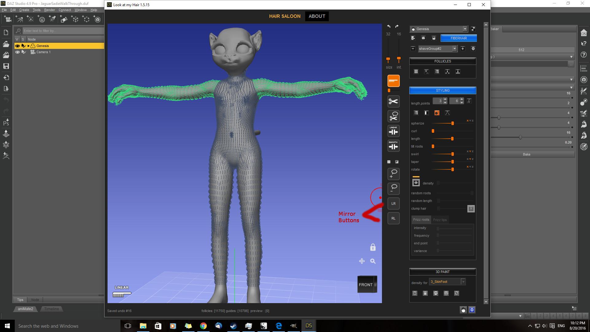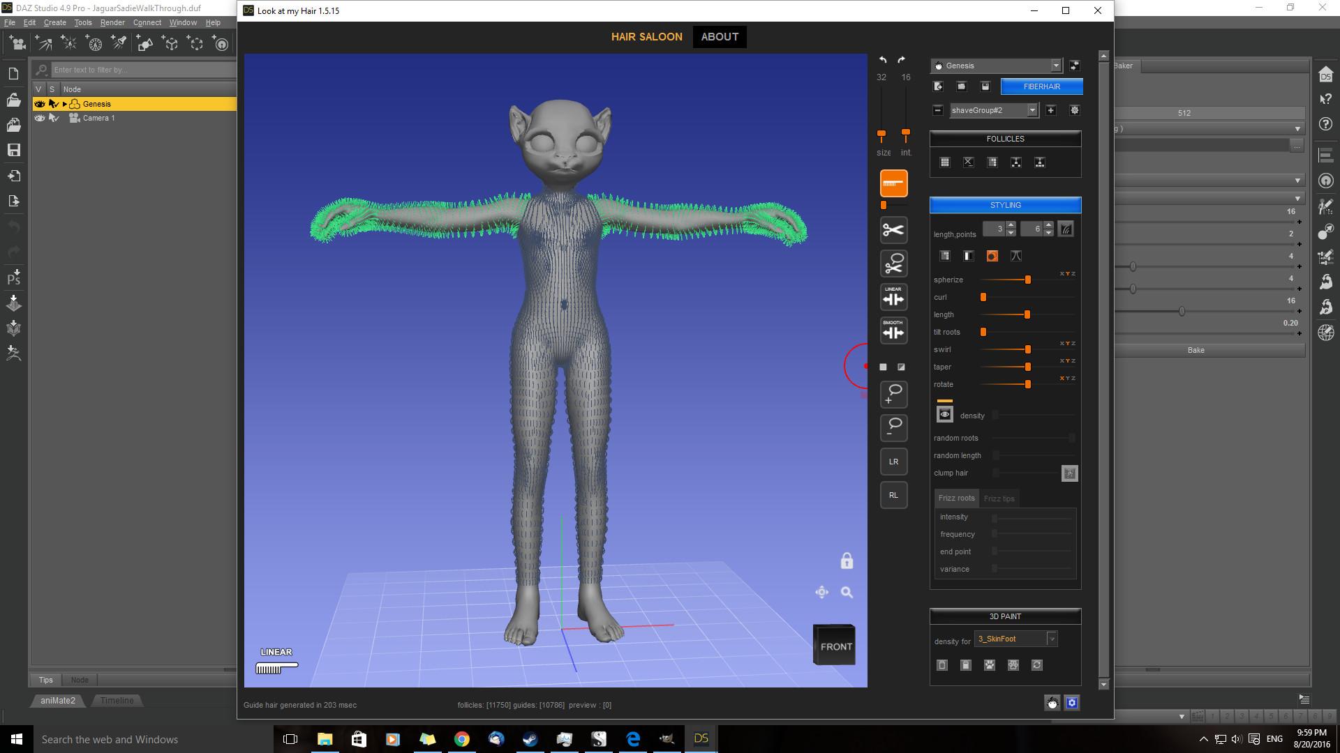 The first thing we are going to do is grow the fiberhair on the surfaces we have in shavegroup#1.  This is the shavegroup which will grow the hair for the neck, torso, hips, and legs.  Jaguar Sadie has short hair so we don’t need it to be very long.  Look at the screenshot in the box that says Styling.  Those two boxes with the numbers determine the length of the fiberhair and the number of points each fiberhair has.  I’m going to change the first number to 3 which is what the length of her hair will be in centimeters.  I’m going to change the second number to 6 so each of our fiberhairs has 6 points or places where the strand can bend. Now push the button next to the number boxes.  It looks kind of like 3 strands of hair.  The button will grow the hair.  If you decide you want your hair longer or short once you see the green guide hairs sprout on your figure, you can change the numbers and regrow the hair until you get it the length you want.  The longer the hair length, the more points you want on the hair guides for styling purposes.  For shorter hair, use fewer points.  AM’s user guides suggests never going down below 5 points for any hair length.