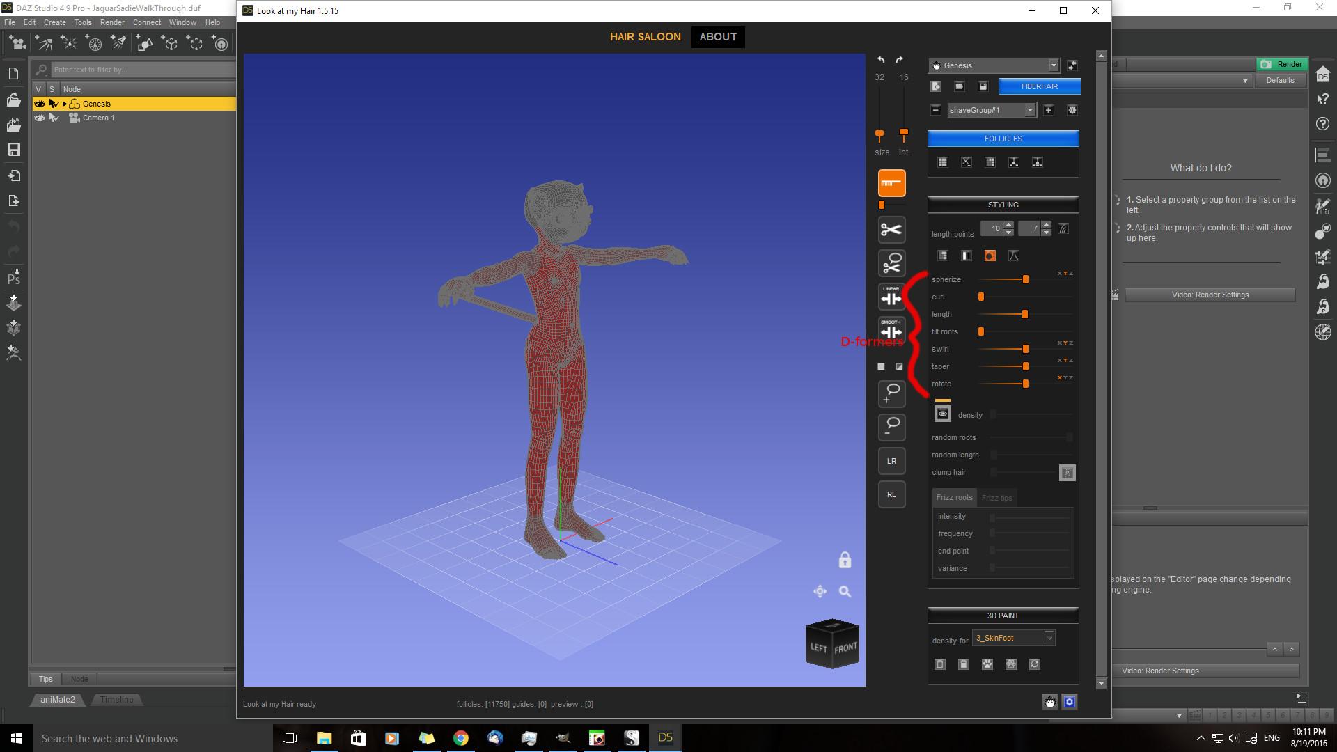 Shavegroup #3 is JS’s feet.  For the feet, put the x y z for the spherize tool back on y.  Move the slider to the right so the guide hair will surround the feet.