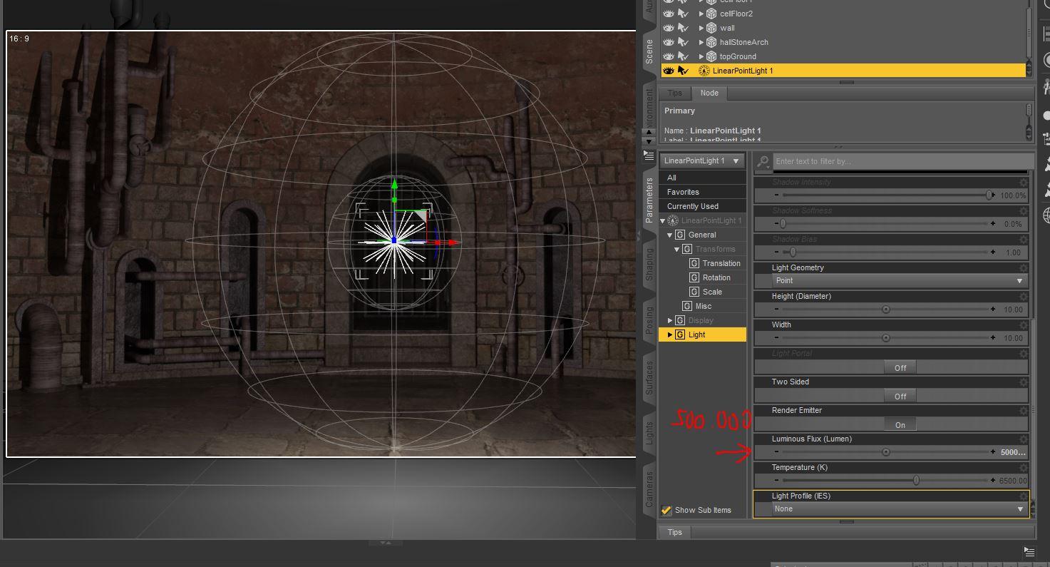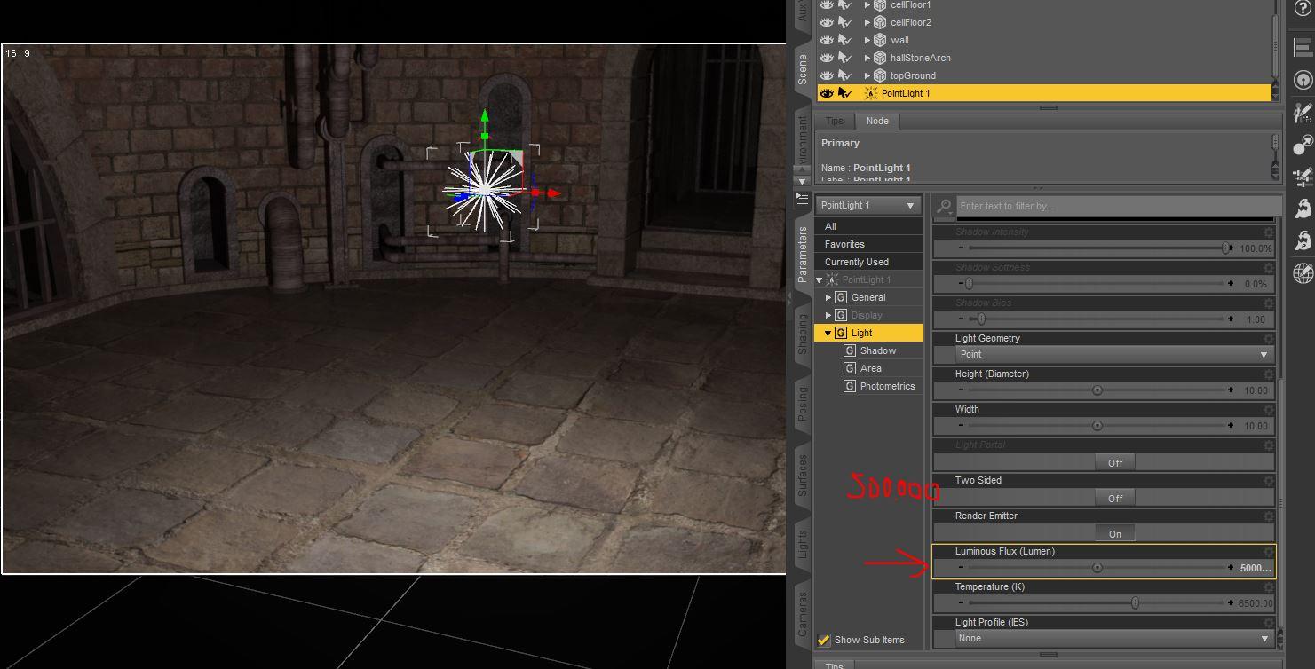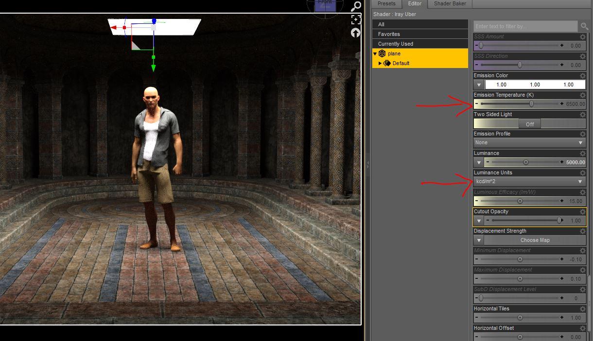 I change the emission temperature to the default 6500K to get a bright white light, and switch the lumiance units to kcd/m^2. As a result, my character is nicely lit, and even part of the room has light.