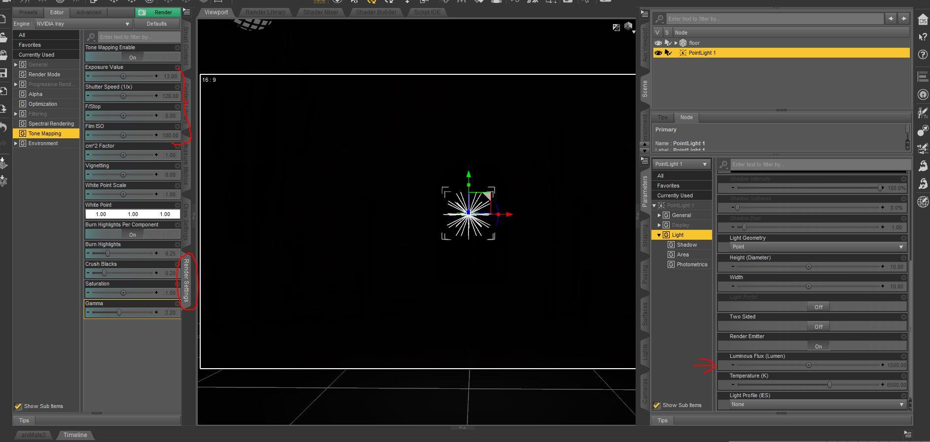 On the right side, you can see the linear light using the default strength of 1500 units. On the left side, you can see the render settings, and I selected the tone mapping tab. You can see the four values at the top. This is the setting that is default, for sunshine.