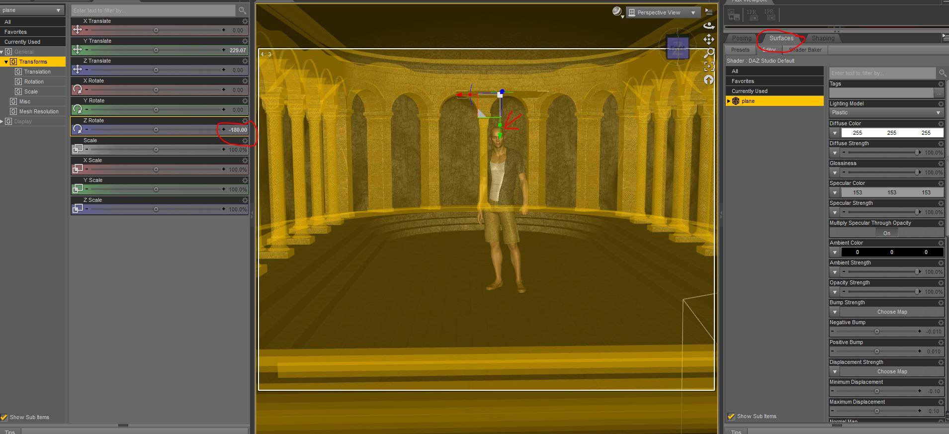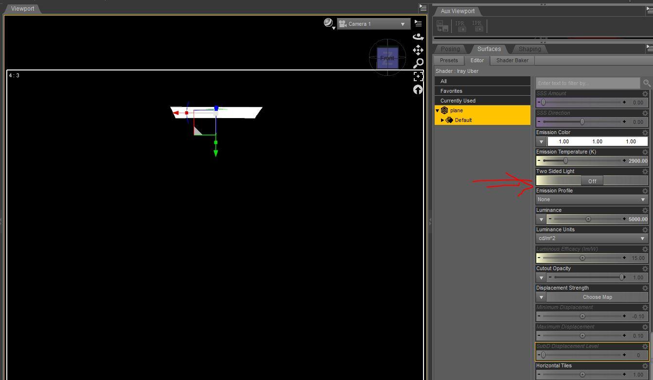 The plane has axis, and you have to rotate it so that the y-axis (green arrow) points down. This is important as I'll turn the light to single sided later, and the green arrow is the direction the light leaves the plane surface. Then, open the surface tab so you can change the surface to light emitter.