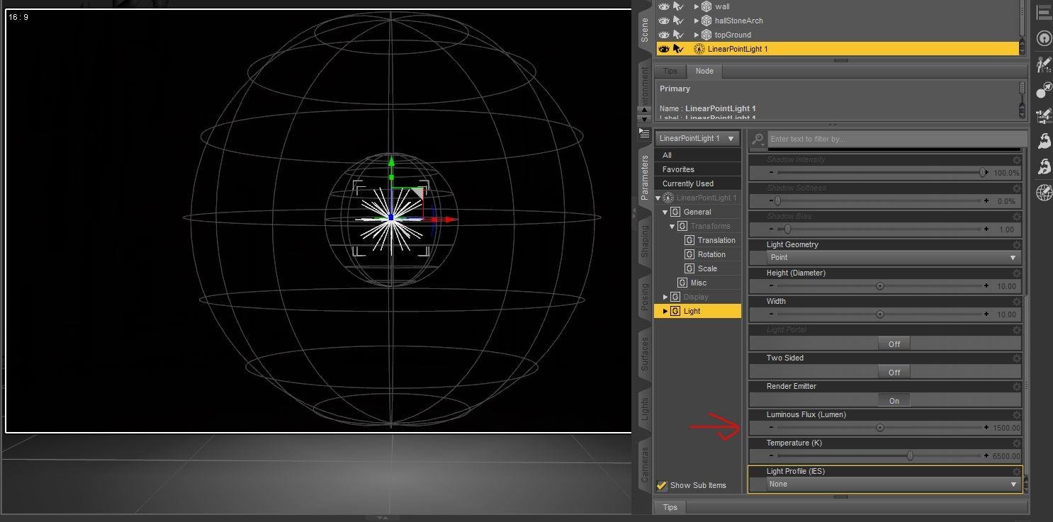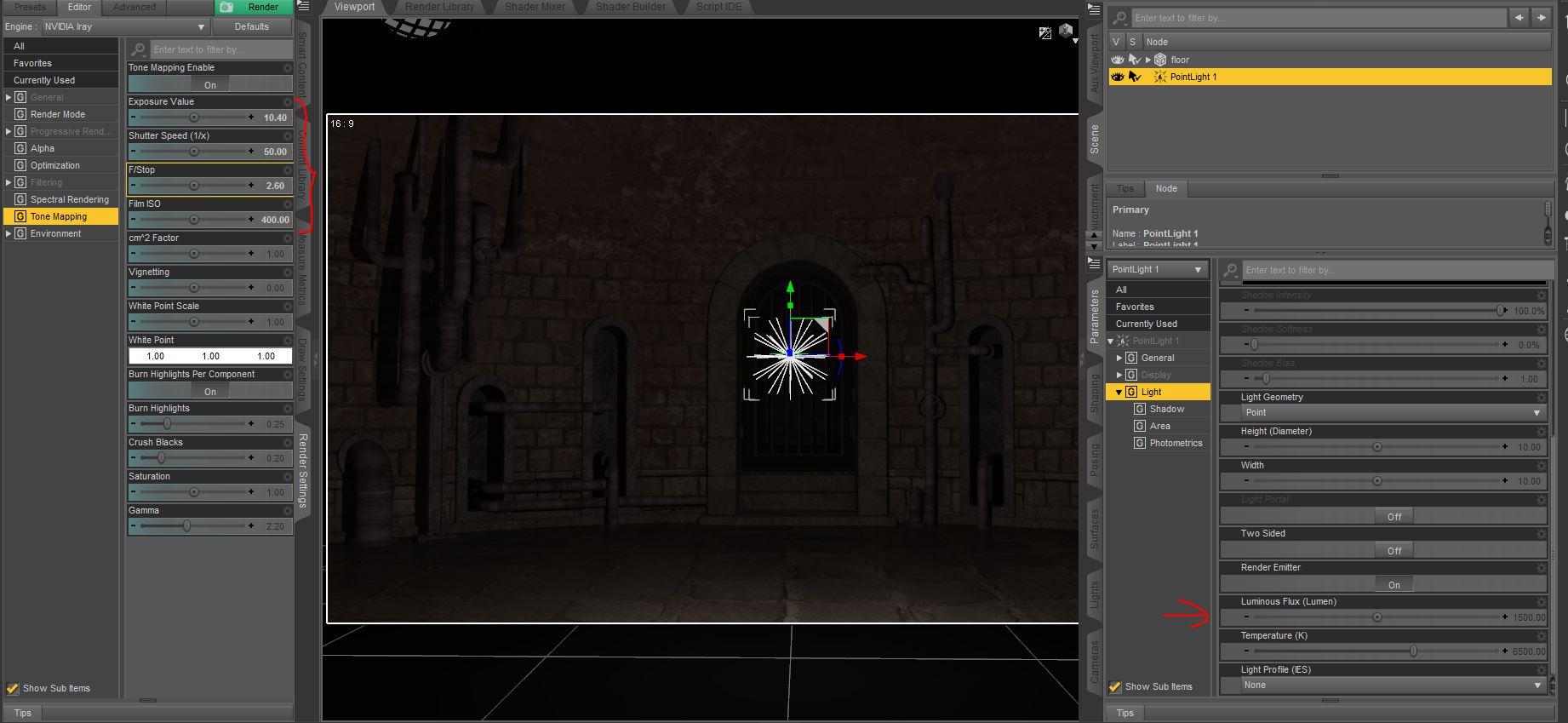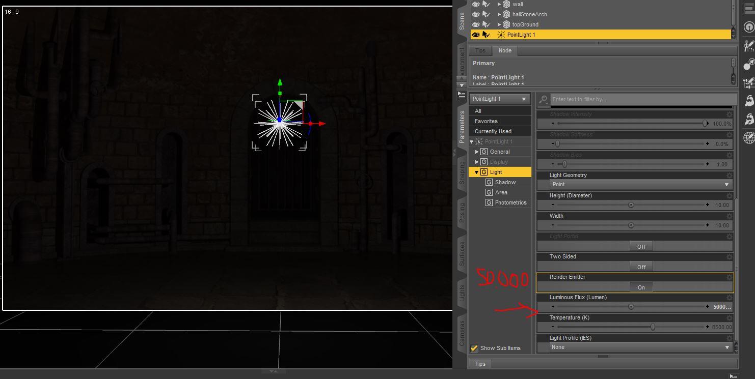 • I have now spent a week just trying to light this room. I tried the mesh light - adding it to a sphere and putting the iRay Uber on it (making it white)... but still no light at all (1). When I render the default scene (3), it lights with seemingly some ambient light and candle and fireplace light. When I add a Point light and really bump up the settings.... Nothing again (3).