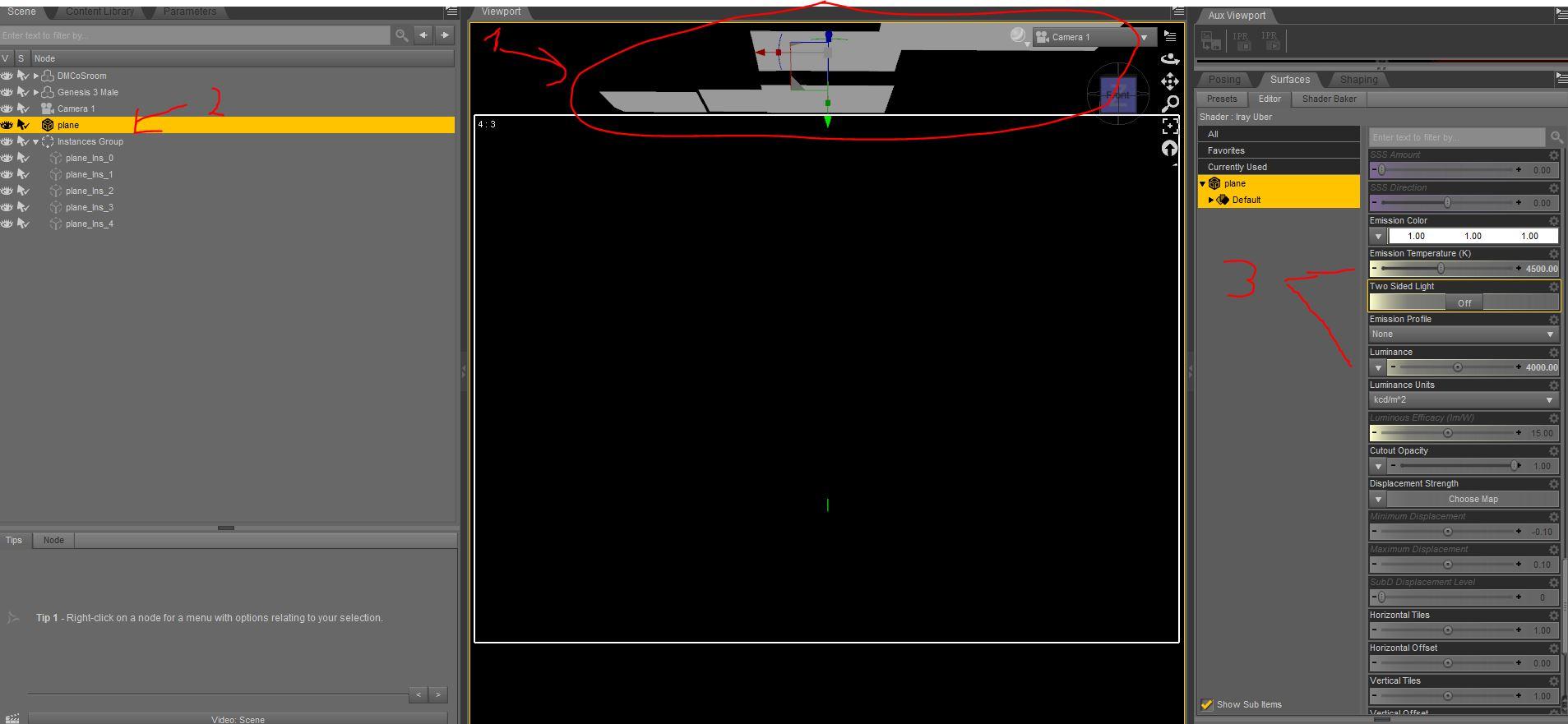To remedy that, I add more light sources by selecting the plane and creating instances (Create --> Node Instances) in my case, I added 5.