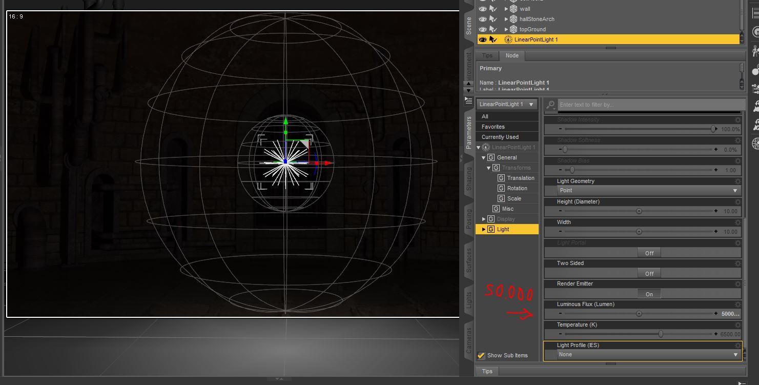3. change the emission temperature to 4500 and the lumiance to 4000 (or whatever suits your scene. Experiment a bit).