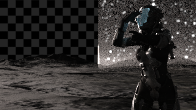 The scene is lit by an HDRI and a little bit of emission from the visor. The BG is just the HDRI, only at -5EV compared to the rest of the scene (accomplished by rendering the view of the HDRI alone through the camera, adjusting the exposure -5EV, and setting it as a backdrop).