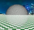 In this next quickie, undercooked render of the scene, I've added a simple ground fog cube onto the right half of the terrain. I've also changed the backdrop to be a checkerboard pattern so that it's easy to see that the backdrop is being completely ignored for the areas where the camera is looking through the volume: