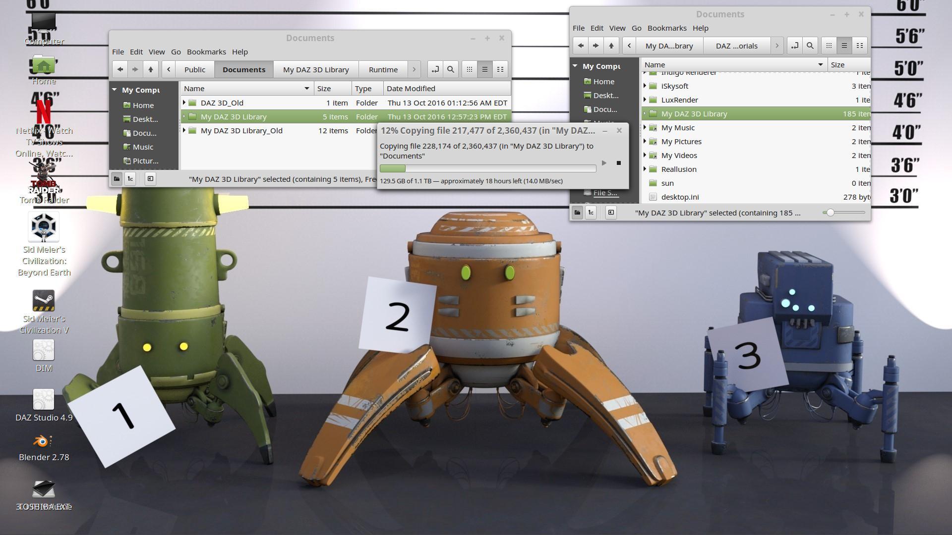 So, Linux Mint 18 is up and running and DIM and DS are up and running. I can now see all of my files and I'm transferring them from the old drive to the new Linux drive where DS can see all of My DAZ Library. And, there are a LOT of them. By the time you figure in materials, textures and shaders, buildings and props, figures and hair, I had a whopping 2,360,437 files that I have to transfer taking approximately 17 to 20 hours, depending on how things flow with the transfer utility, if I don't want to have to install everything all over again. Needless to say, I won't be rendering anything any time real soon. It might take me a couple of days to get back up to speed. Luckily, most of my downloads were on a separate portable drive so if the Windows drive wasn't readable at least I wouldn't have had to download EVERYTHING! :)
