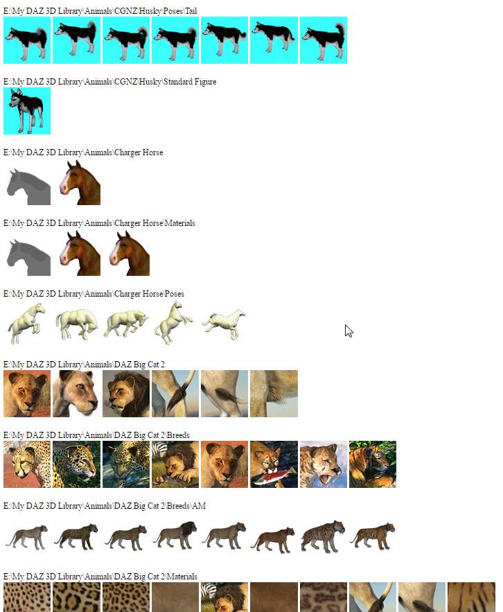 7. The catalog follows the folder structure of My Daz 3D Library. It goes down every branch in alphabetical order and will create a section of images for each folder that contains standard 91x91 thumbnail .png's along with the folder name. One of the nice features is you'll have a section where all the animals are gathered in one place and you can quickly scroll down to see what you have. Same for architecture, shaders, poses, vehicles, etc.