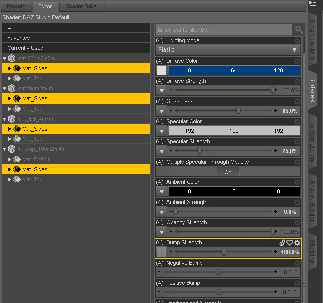 And there is the simple settings, not all that complex. I do adjust the Horizontal and vertical tiling (16 x 16 in the above example render) to get things fine-grained enough ("Good enough", not perfect, nothing is perfect, lol). The Diffuse color can pretty much be anything you want it to be for that surface, and Specular and Bump strengths may need to be adjusted for your particular taste.