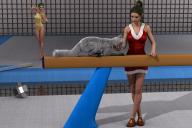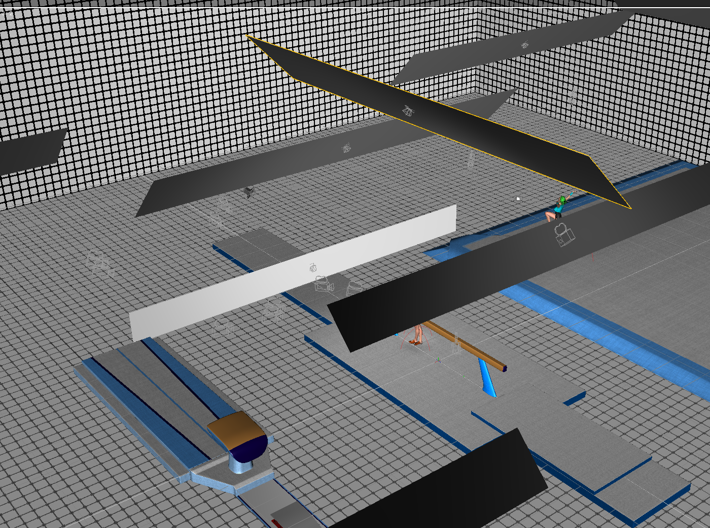 It Includes the FIG podium layout, spring floor (FX), Balance Beam (BB), Vault Table (VT or just 'V'), D-formable mats, and some other stuff.