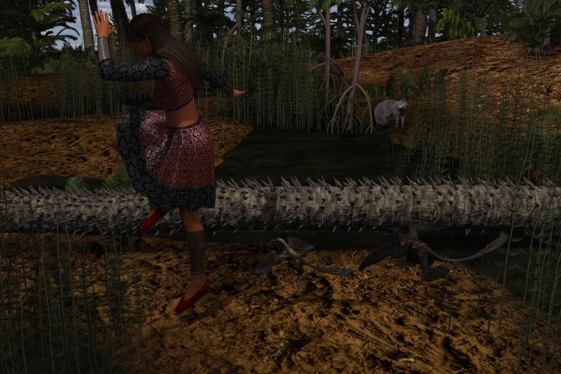 It's one thing to line up a shot, and need to wait around forty seconds before you see that the camera is in a tree or behind a leaf, lol. Add a half hour delay from some HD figures and that is impossible to work with on some scenes. I literally wasted an hour trying to find a spot to do the render from, because there are so many plants bushes and trees in that scene that are NOT in the view-field. Thankfully Wachiwi (G2F) has Daz default mats, and none of the other critters had significant face plant time in 3DL.