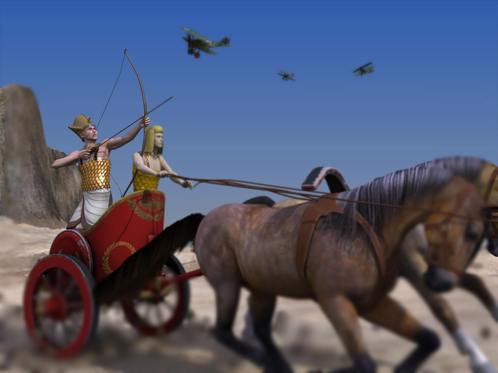 I've never been satisfied with the transmapped add-on tails that come with the Daz Horse 2.  Here I've replaced the transmapped tail with a Carrara dynamic hair object.  The sky is a bigradient.  The terrain was customized in the Carrara's terrain modeler.  The British biplane is from 3DUiverse.  The chariot is from i13.  The Egyptian archer is the Poser 7 Male Simon with the world leaders' clothing for Ramses.  The chariot driver is Daz David 3 with the D3Egyptian knight outfit.  Some adjustments in Photoshop Elements.