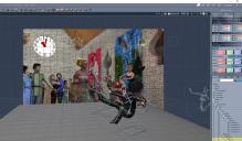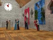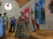 Here is an update of my first idea if you go back to the early pages of the thread.  Cinderella's hair is a custom hair style.  Rendered separate images to be put on wall decorations.  Then rendered room and back figures with banners.  Then added more figures by putting previous render in the backdrop and using a shadow catcher for the floor.