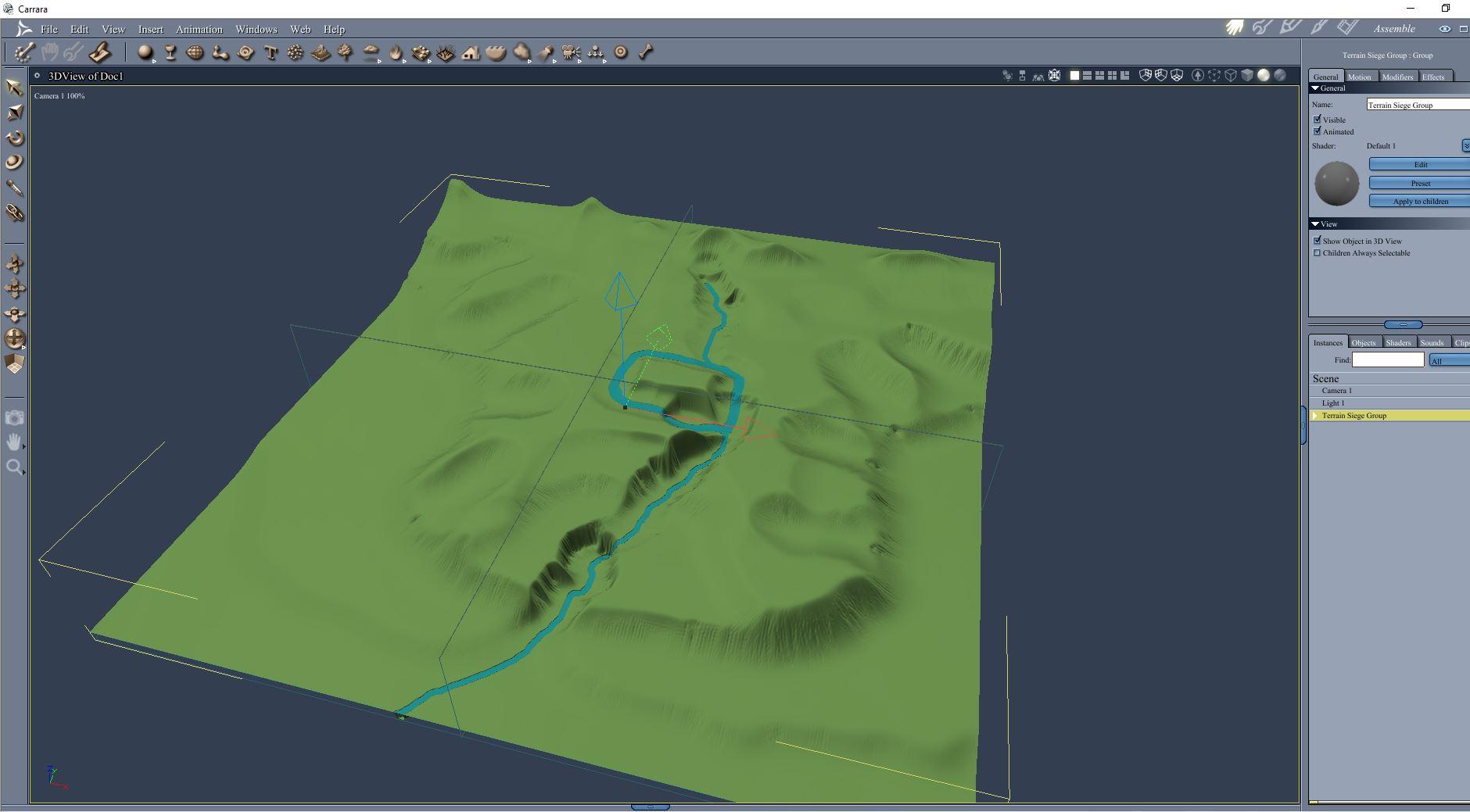 Creating a terrain that offers several different potential locations for my different entries.  This is just the default terrain shader and a light blue color for the river.  I will post more details on the methods in my screenshot thread. Here is my basic workflow for creating a  river valley with Carrara's terrain modeler and my image editor (Photoshop Elements, PE).