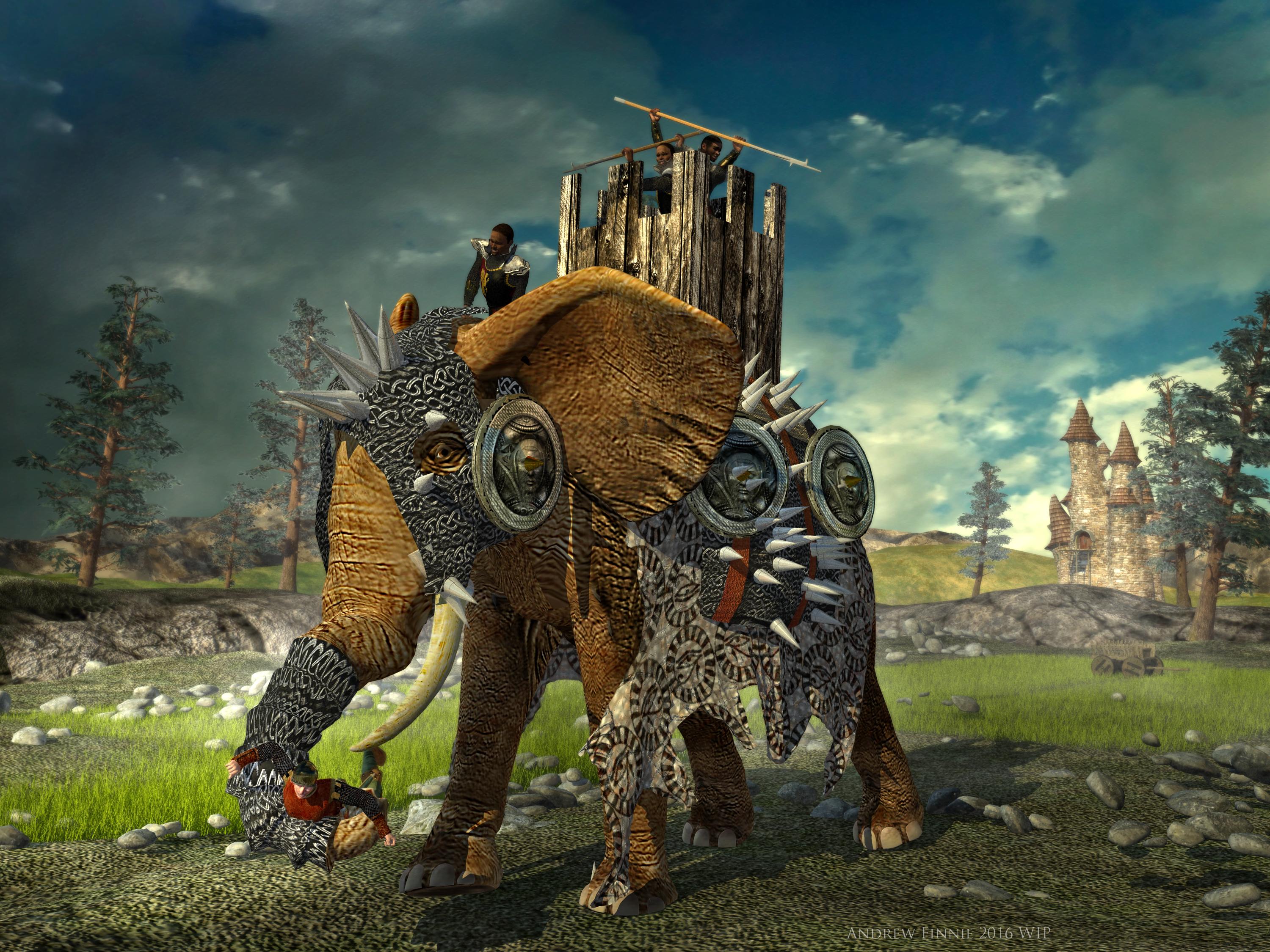 modelled artmour, shields, , used VWD cloth plugin for eye textured 'rug', used surface replicators for spikes, retextured elephant with slightly higher res textures, modelled castille thing on top of elephant, still to add post work smoke etc and other solfdeires with arrows, plus an eagle or two