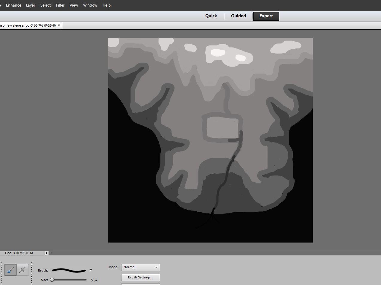 - Start in PE and rough out a crude grayscale map my intended terrain on a large square canvas (1025 x 1025).  Make sure the river area flows down (darker colors).
