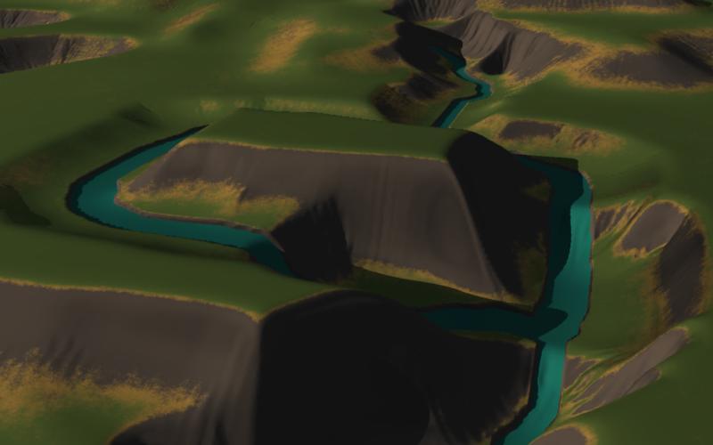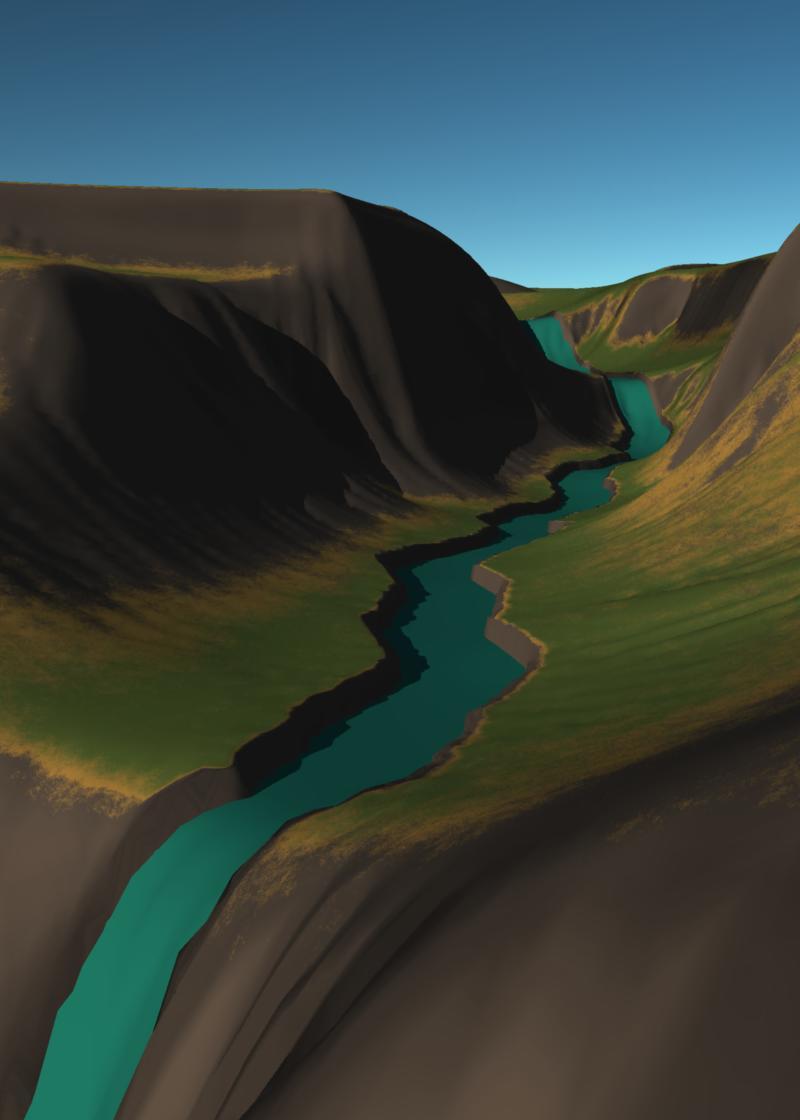 - The new terrain should now have a river bed carved near the bottom of a river valley.