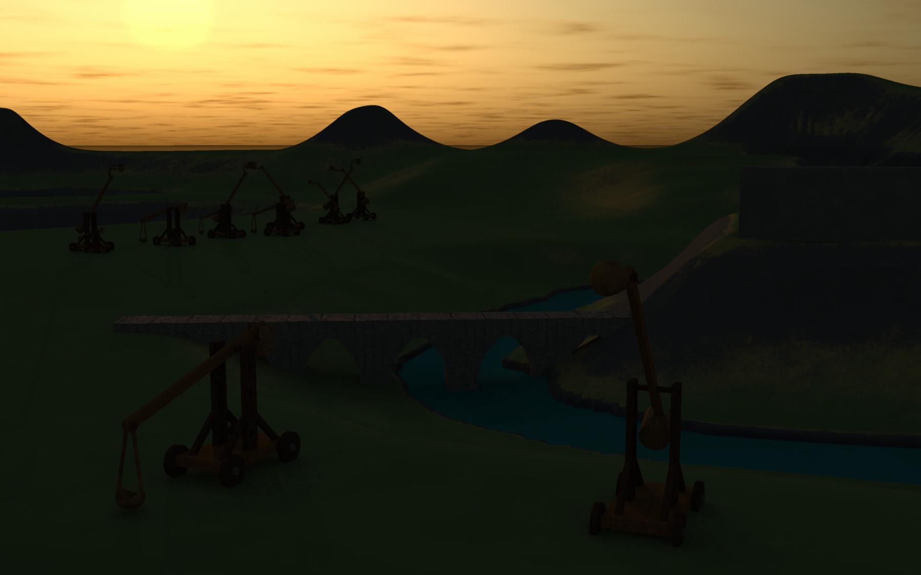 And here is an update on one of mine.  I mentioned that the terrain had a place for a moat and castle.  I've replicated some catapults around the moat.  I've also inserted a bridge over the moat.  All the shaders are screwed up, and there is no castle yet, and no army for the siege, and no....  The test render may be too dark because the sky light is sunset and I plan to have other lighting generated by stuff being on fire.