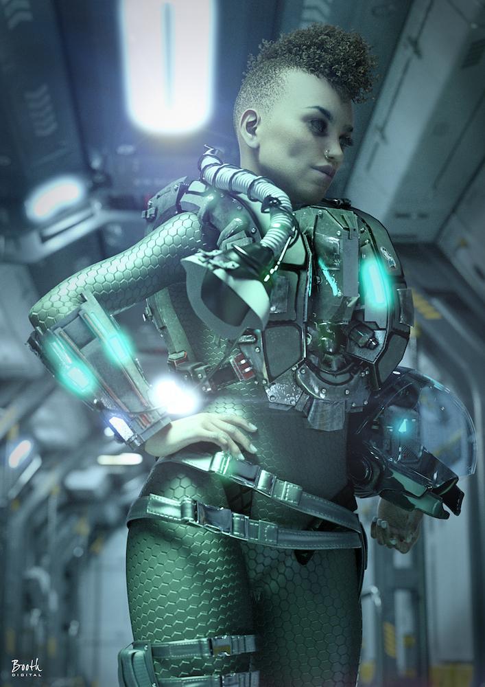 With this render, I further dialed her in by toning out her body and adding muscle definition. I also worked with the skin settings and added some veins texturing.
