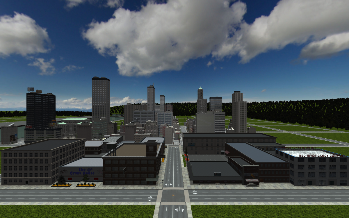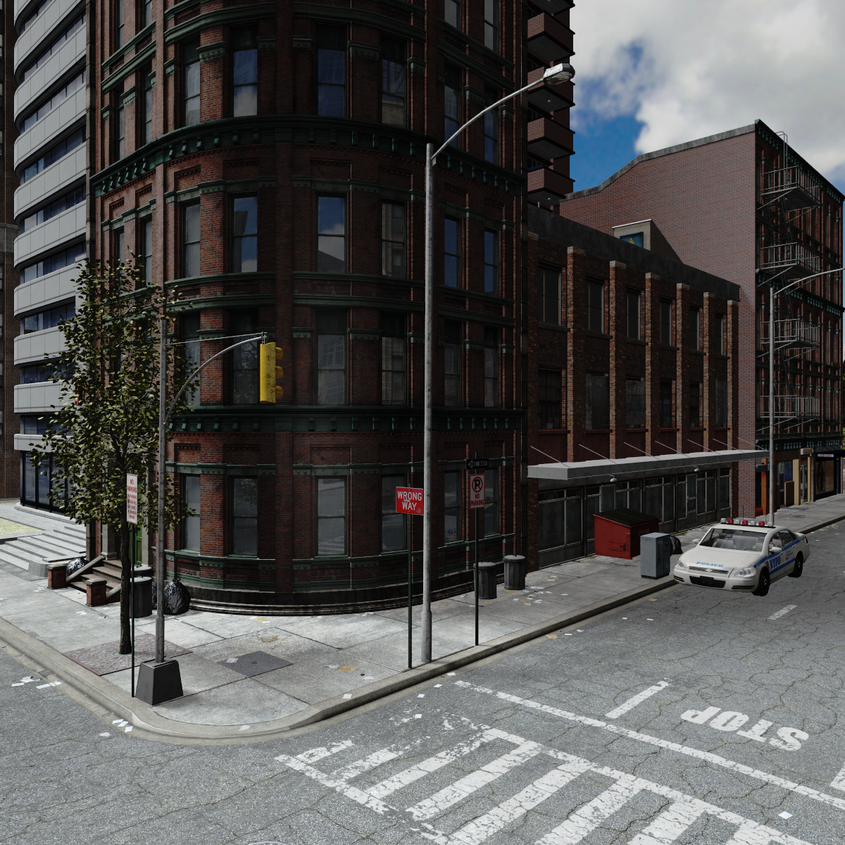 One big difference between the two product lines are the look and details. RF is quite clean, with fresh sidewalks, streets, and building textures. There's some details that load, like stop signs at corners and billboard trees and it also comes with electrical poles with wires you can add. But if you want other common street elements like mailboxes, litter, trash cans, etc., or you want buildings/streets with more variegated textures, you'll have to add that yourself. US3 comes with much of that already in place. The trees are 3D models, there's litter in the gutters, trash bag piles by buildings, mailboxes, street signs, etc.