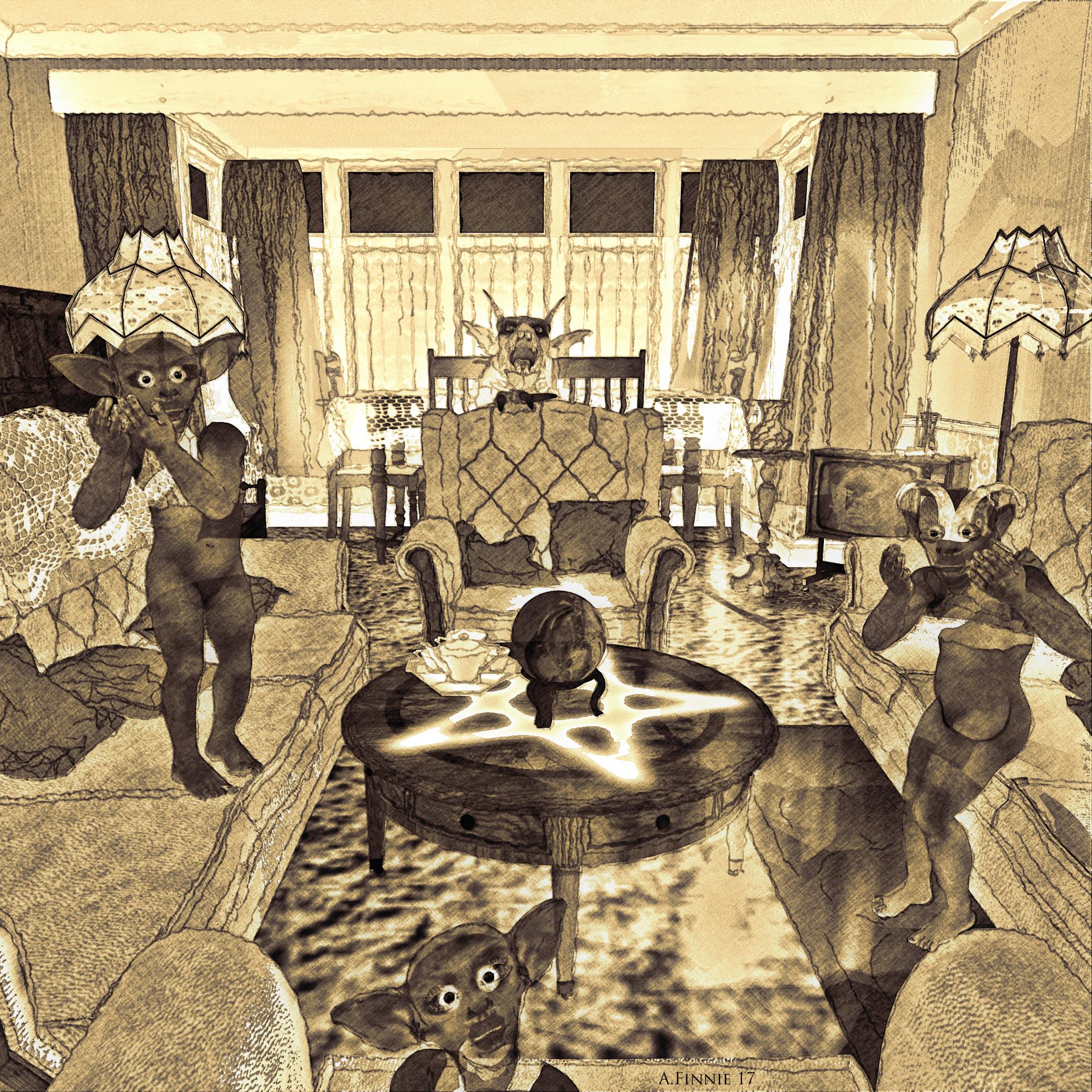 shadow pass added... then removed most items from scene and did another line render of the skellmaid and added in post to try and accentuate her.