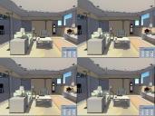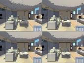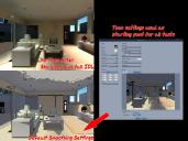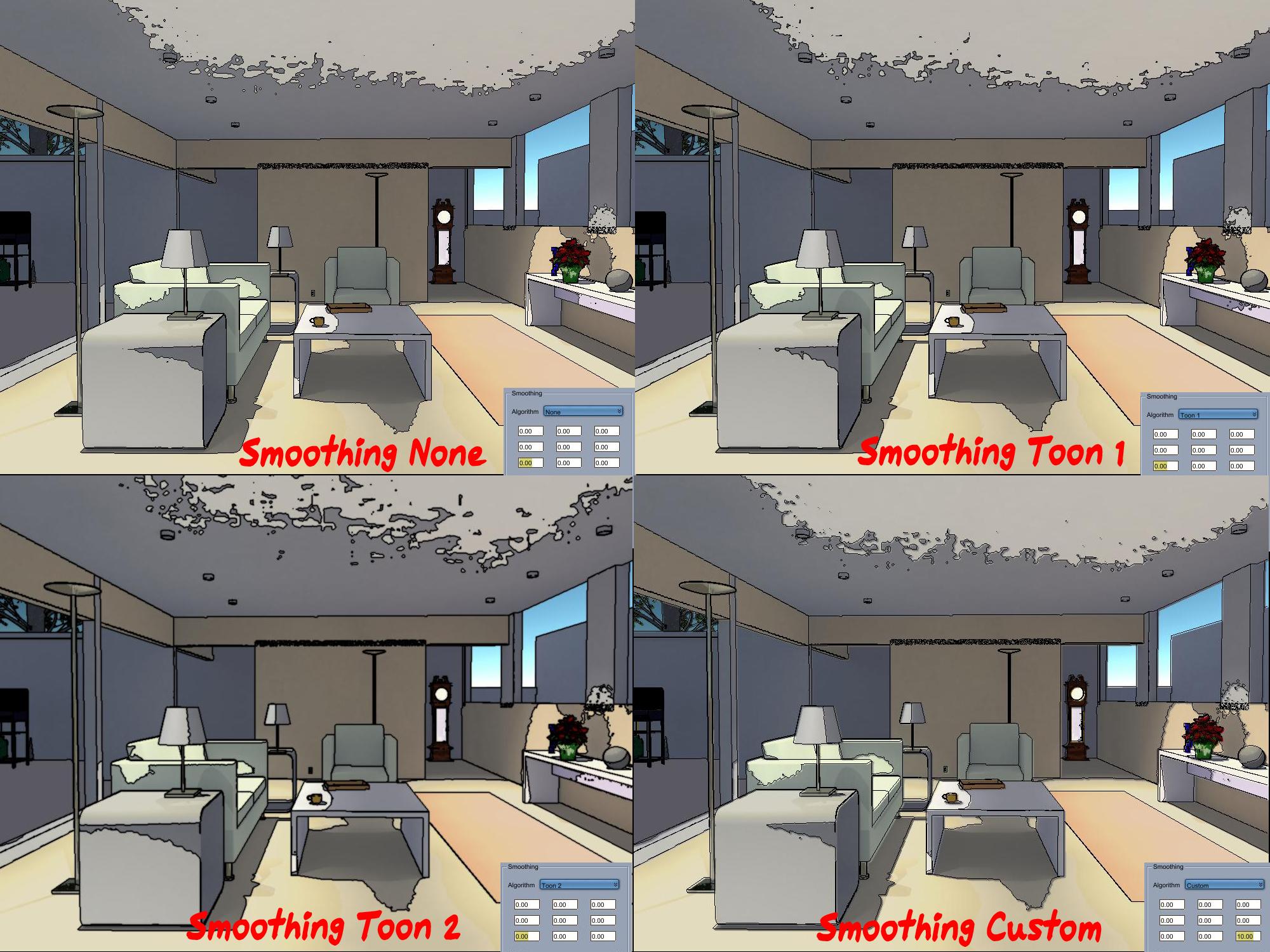 Then I saved out a series of scenes, changing only the smoothing settings for each and did a batch render of them.  The first three are the presets (None, Toon 1, and Toon 2) and in the remainder use custom settings where I set each of the boxes to a high value and left the rest at 0.00. Even with the settings at such a high number the differences can be subtle - with the images at full size, look at the shadows on the ceiling, on the floor in the middle and under the table on the right wall to see some of the differences.