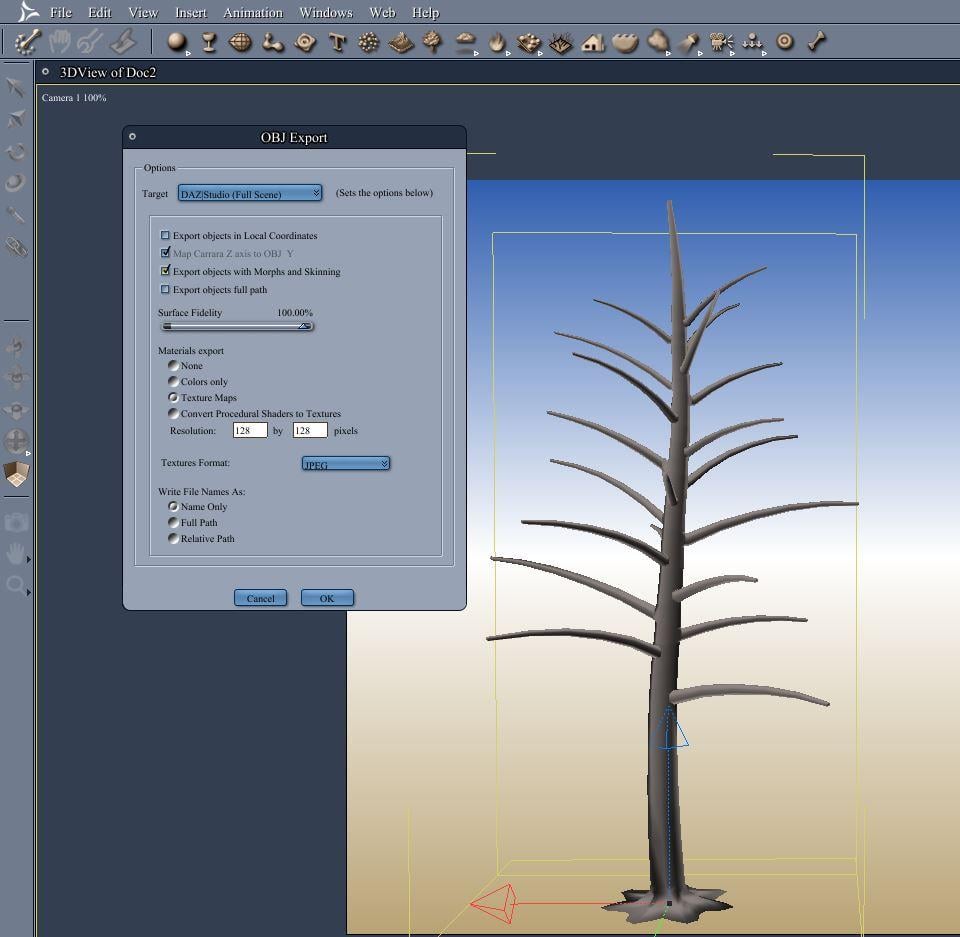 Then I returned to the main Assemble room and selected the tree.  I then exported as an obj using the Daz Studio (full scene) settings with morphs and skinning checked.