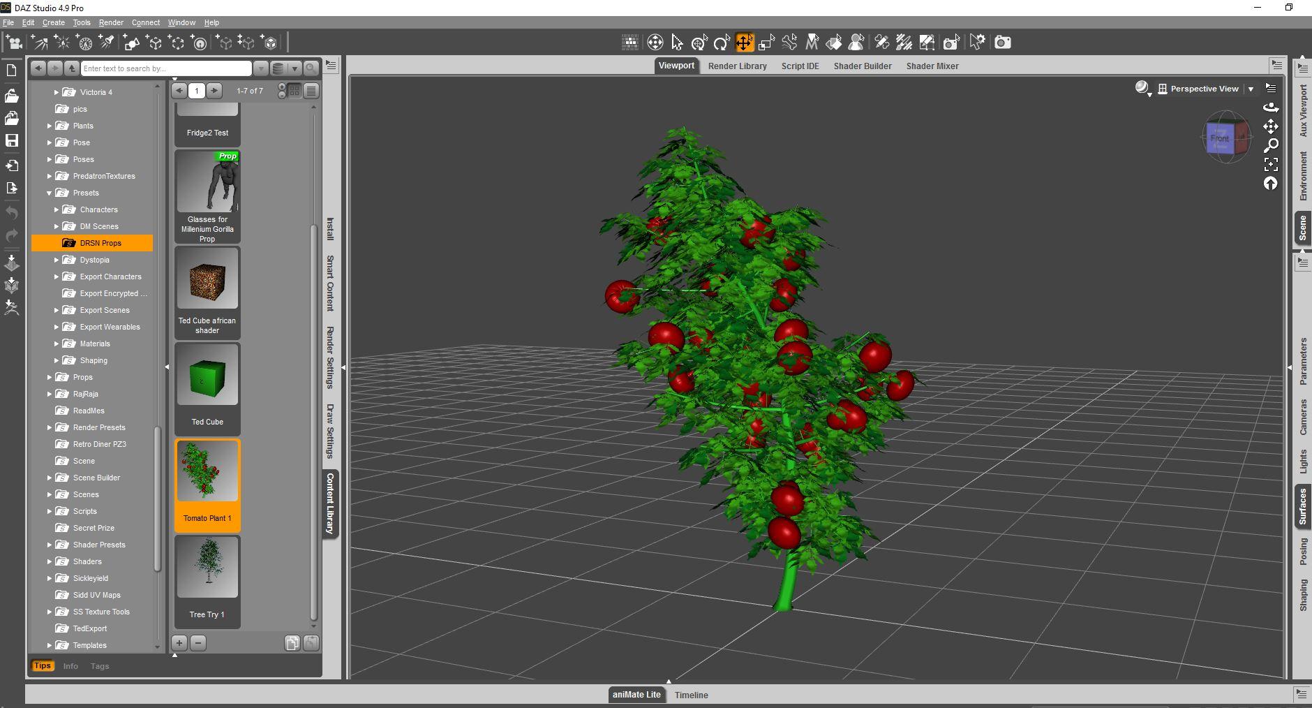 Using the method posted above, I created a tomato plant and saved it in DUF as a Studio prop asset.  Happy to offer as a freebie, although it only has very simple procedural shaders right now.  Is there a preferred file structure for sharing DUFs?  How are the folders for the mesh, textures, and DUF organized within a zip file to share?  I have shared Poser files, Carrara files, and objs, but not Studio DUF files.