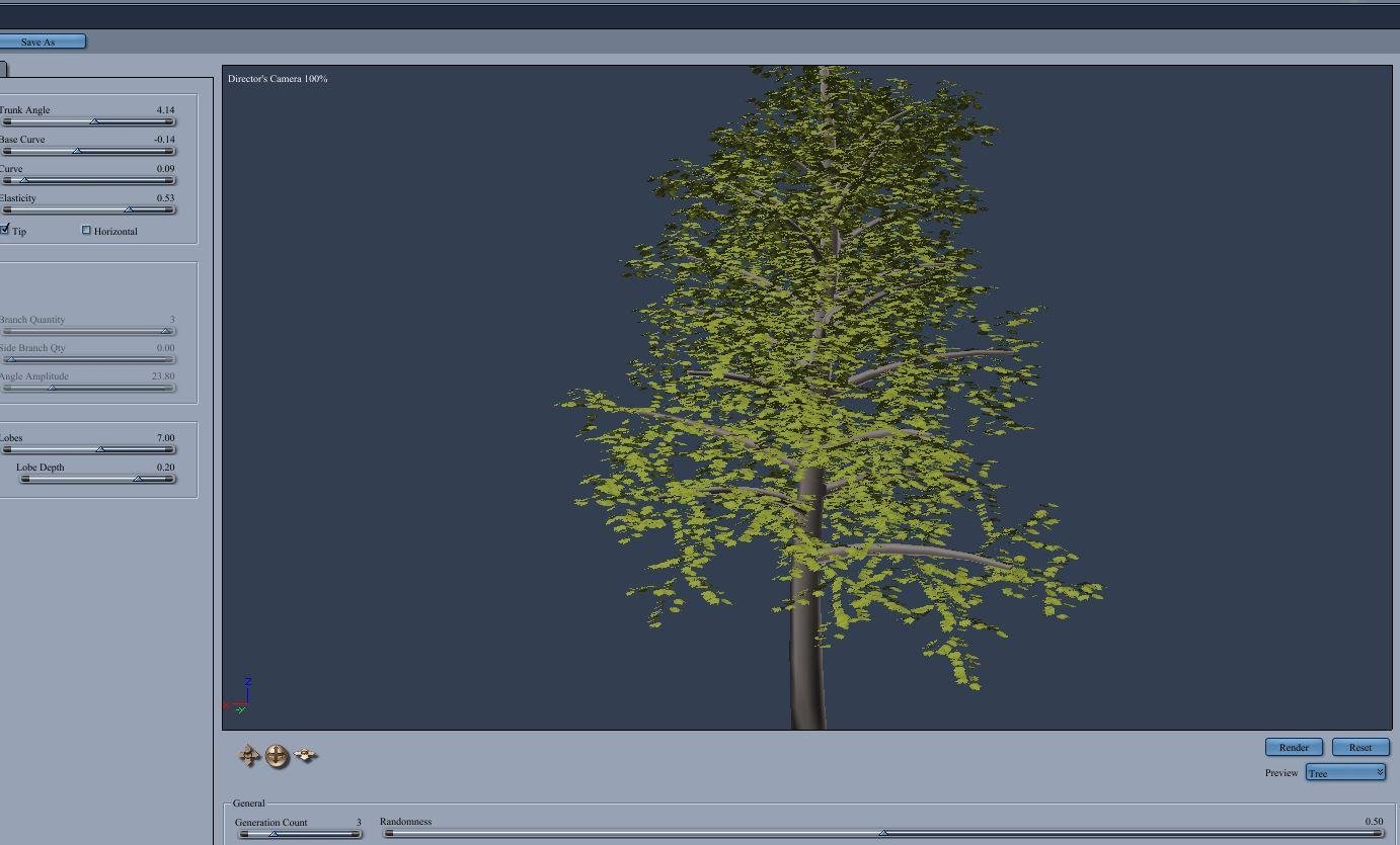 While taking a break from learning about ultrascatter for the robot army, I decided to see if I could get a custom tree from Carrara to Studio.  While I was nominally successful, The polygon count was way too high to be practical (99,000 for my first attempt).  However, here was the workflow.