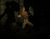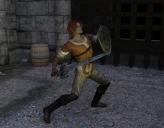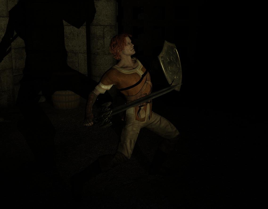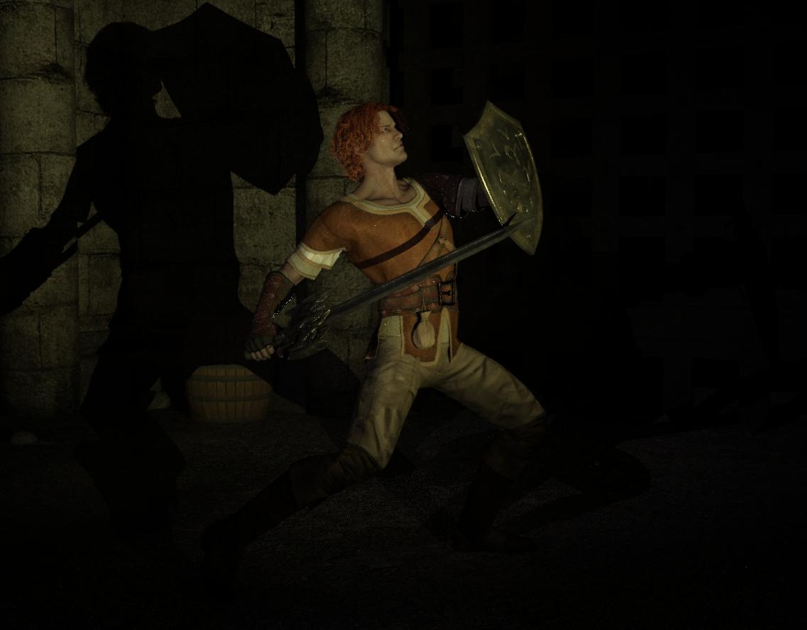 I don't know why I can't seem to retain any information about lighting.  I can't remember how to turn off the headlamp from the camera.  Or maybe it is a bunch of ambient light flooding the whole scene?  I purposefully rendered Michael in a Courtyard with a Sword using just a key light and a back light to see if I had control of the lighting.  Nope, I'm missing something.  This scene should only have two spot lights that I inserted, according to the light pane.  Well, only two can be selected.  The first is coming from the lower right pointing slightly upward.  You can see its effects by the hard sword shadow on the chest and the yellow tinge to the shield and sword.  The backlight has a blue tinge and is behind Michael pointed at the camera.  Where is all this other light coming from and how do I adjust it?