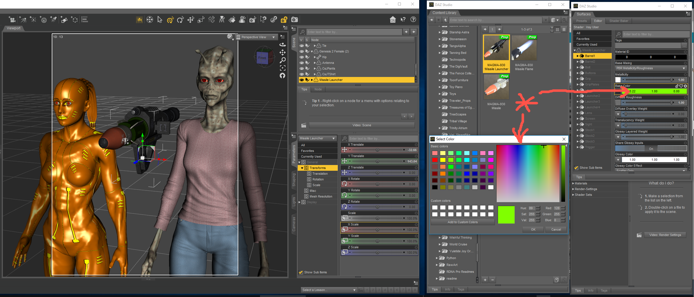 4 - gun has many shader domains / material sets.  How do I see where barrel 1 is vesus where barrel 2 is etc.  I just randomly assigned metallic iray shaders  (thank you, TobascoJack above, for the Iray shader links - again, I need to spend the time)