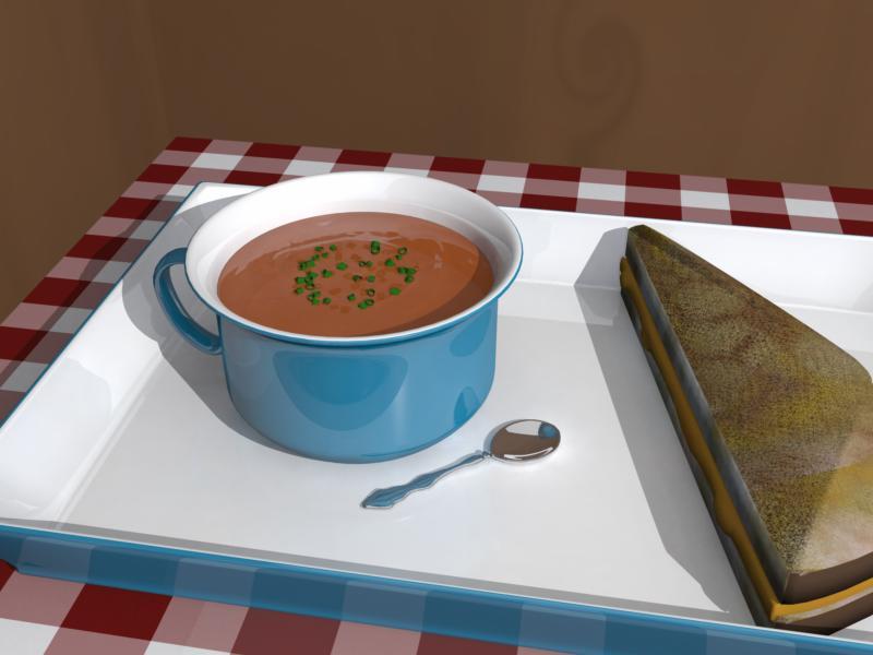 Thank you for the comments.  I will revisit the soup reflection settings.  The 3DPaint tool might help there.  Regarding the grilled cheese sandwitch, I'd better start over. No one wants to eat an undercooked and moldy sandwitch.