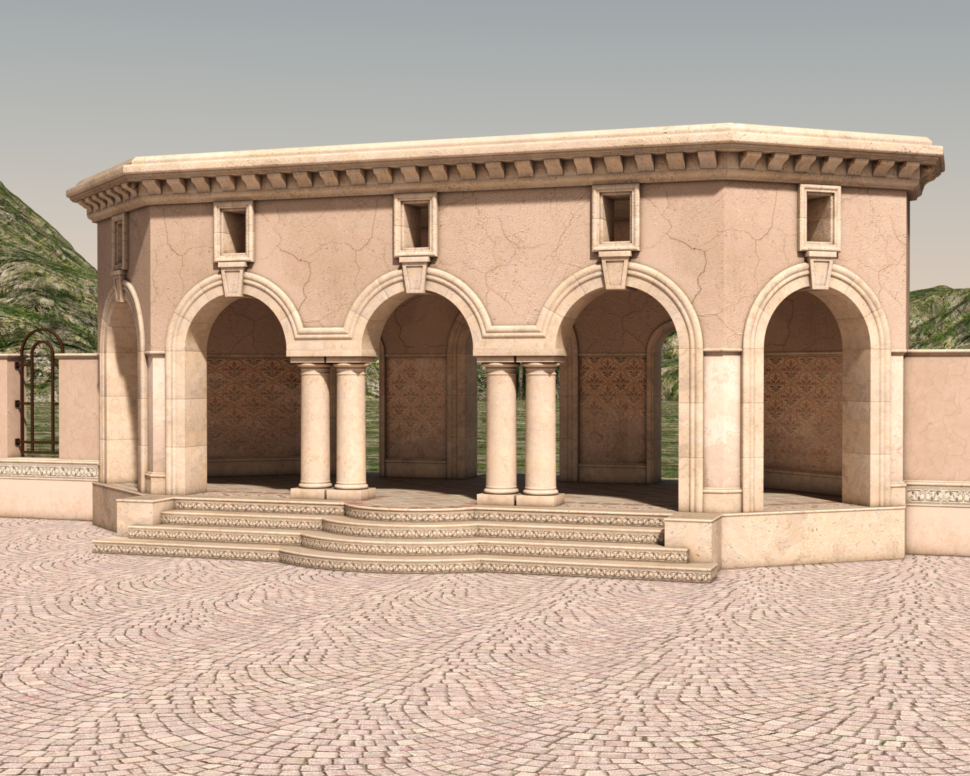 I used the Tangien Portico in "The Weaker Sex?" an Iray render done back in July of 2015. Still learning Iray, I applied the Iray marble shader that comes with DS to the building and the ground. If I were doing that render today, I'd use one of the 3DL materials and convert it. Much more interesting than all the marble!