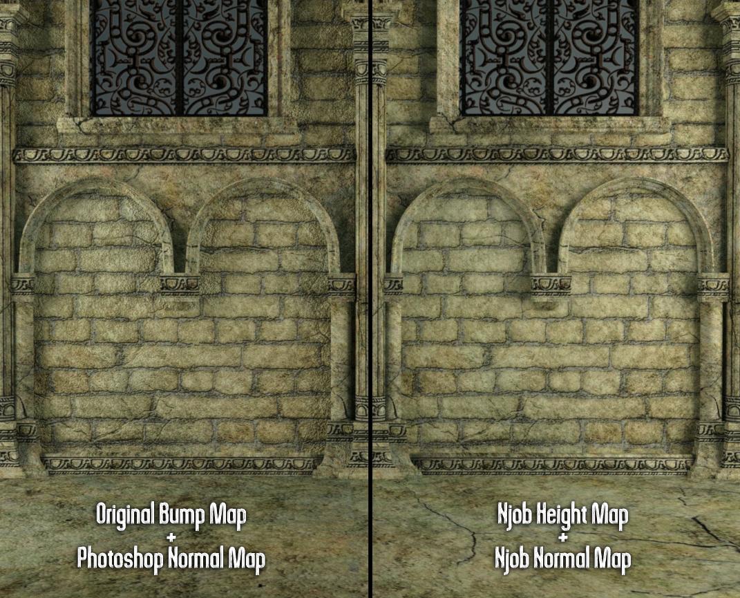 I chose to not compare Njob to Photoshop generated normals. I'm not sure if the normals created by the Nivida filter are the same as those created by Photoshop CC, and while I don't fully understand what they do, there are a lot of options with the Nvidia filter which can change the final output. Instead, I concentrated on showing how much better the Njob version looks over the original.