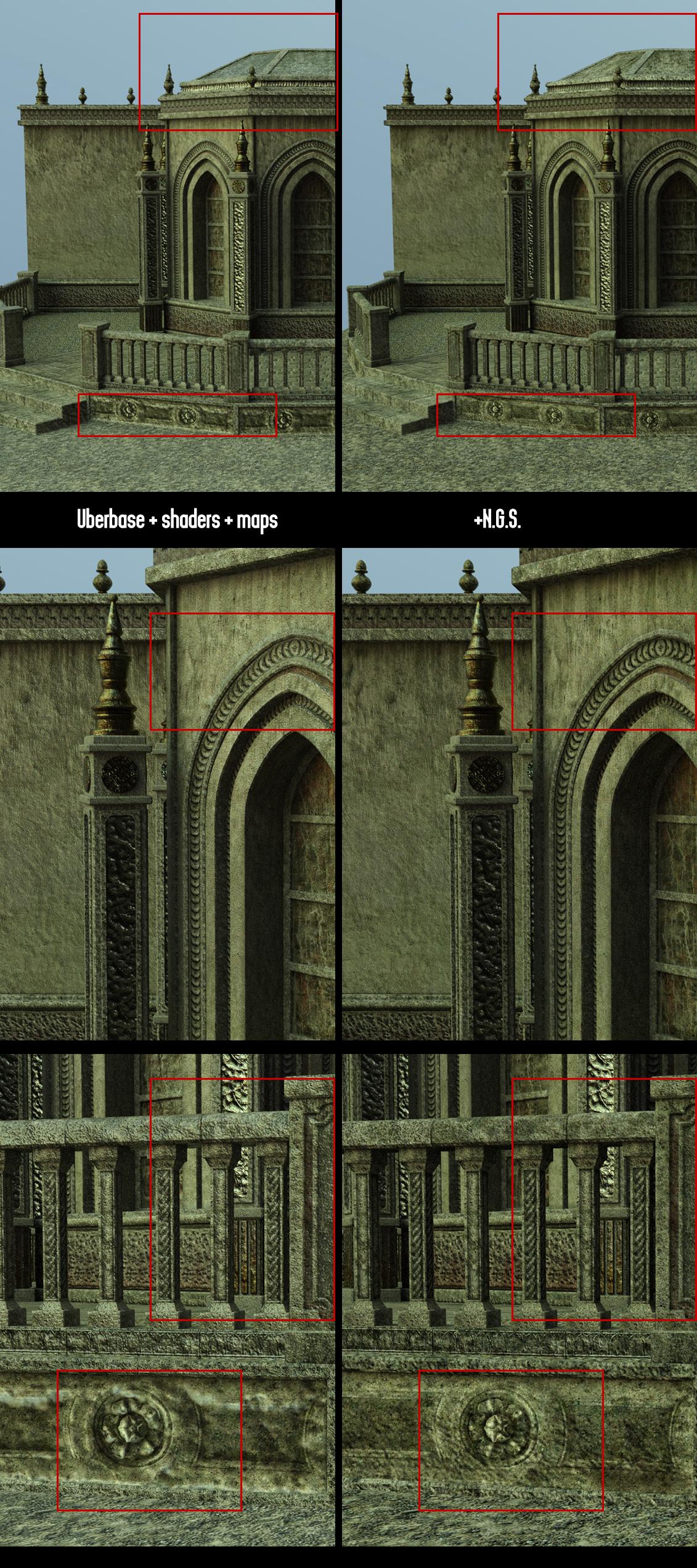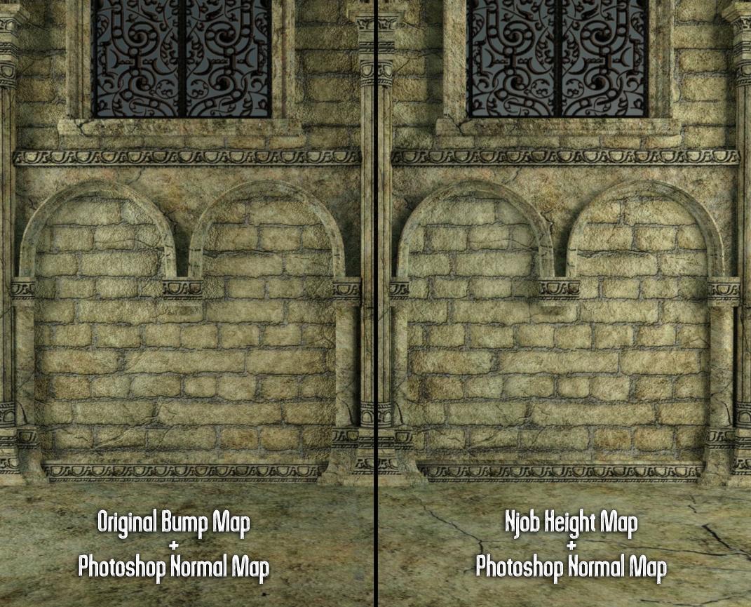 The lighting and camera angle are identical, but the Njob render appears to be darker. My theory is with the new height and normal maps, Gadomar has more fine detail, producing a lot of small shadows, but I really don't know why... The carved stone appears to have more depth; with darker shadows, lighter lights, (in some cases,) and rougher texture overall.
