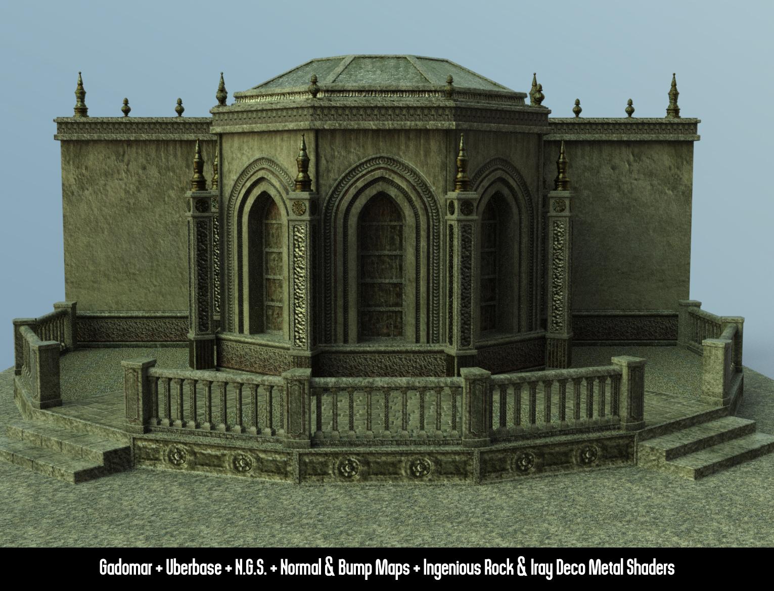 First of all, Gadomar includes a lot of detail modeled in, as seen in the render with the textures removed. That goes a long way toward making the set look good in Iray, even without adding normal maps. This set uses the diffuse image as the bump image, too, so there is some bump. However, the default value for bump after the conversion is too low for Iray, and should be increased.