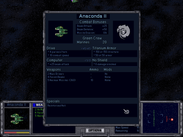 This screenshot I took before I stole Shielding I from my [now conquered/eliminated] rival, hence why it's unshielded. Actually, this was taken in the battle that reduced the guy to one colony ^_^; (The ship I have selected is a um... Battleship I think it is? I'm still getting accustomed to the ship ranks :P )