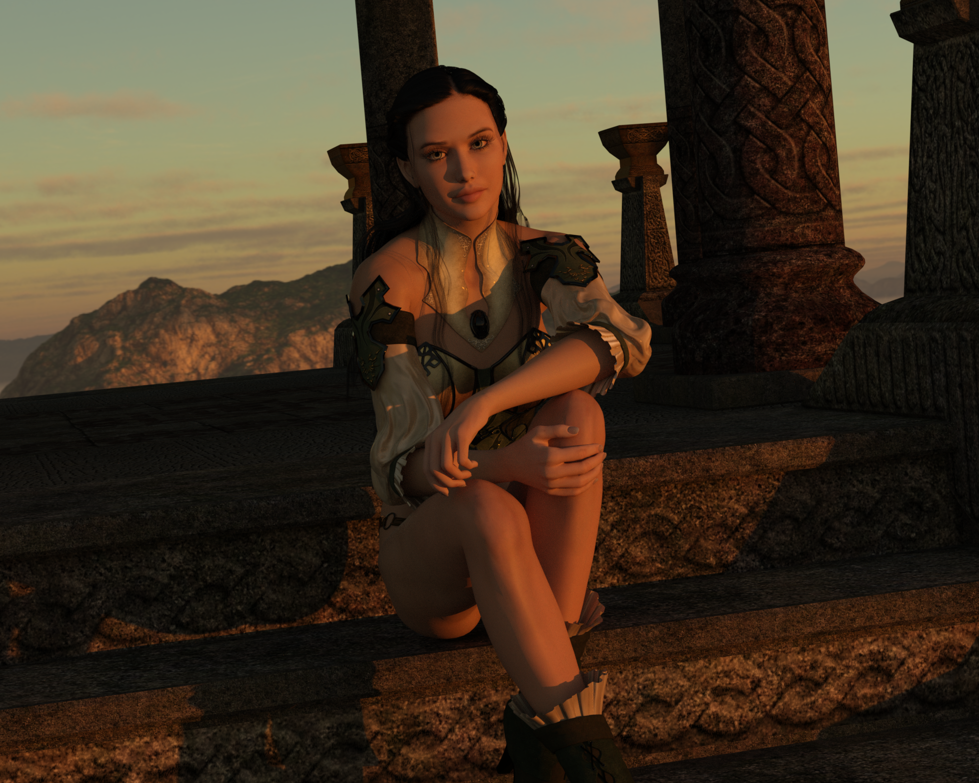 I love her doll-like appearance, plus the fact that I can render her in Iray or Superfly. The lighting is a bit flat in this one. Was testing DM's set, Sancturio as well as an older spellcaster outfit (can't remember the name of it at the moment.)