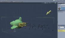 I modeled a spaceship. I created a shading domain called engine squares. I put the square polygons inside the engines facing outward. In the particle emitter modeler, I selected the shading domain engine square.